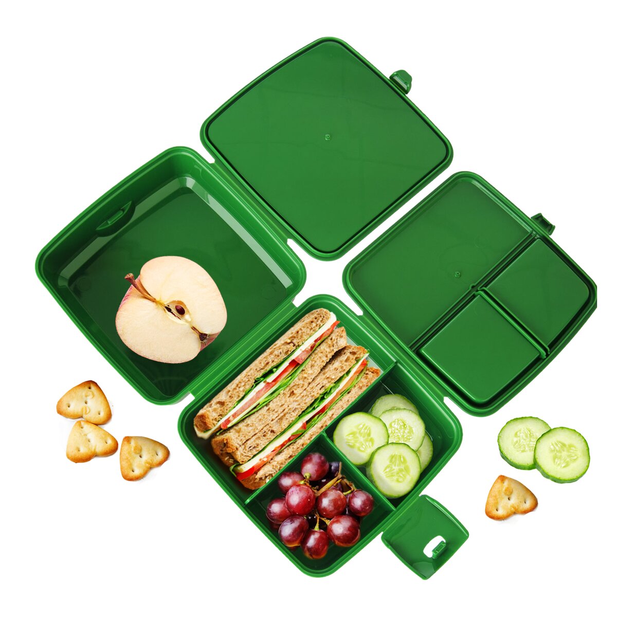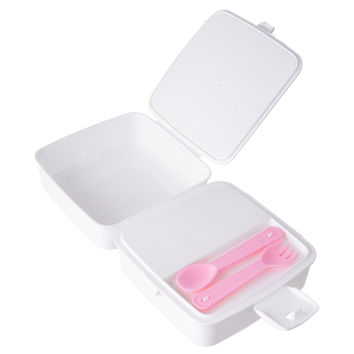 Dělený box na svačinu uloží potraviny, snadno je přepravíte, neosychají. Můžete využít také k uložení drobností. Součástí je malá lžička a vidlička. Materiál: plast. Barevný assort. Uzavírání na klip. Rozměry: 15x15x9 cm. Vhodný do MVT i myčky na nádobí.