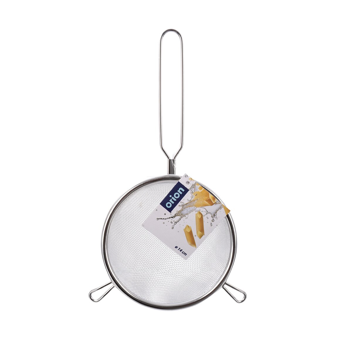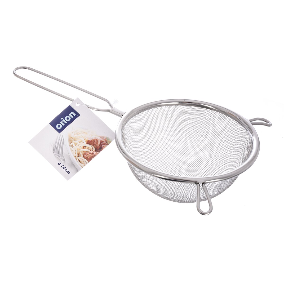 Kód produktu 124433Nerezový cedník o průměru 14 cm s jemnou síťkou, delší rukojetí a dvěma zarážkami.