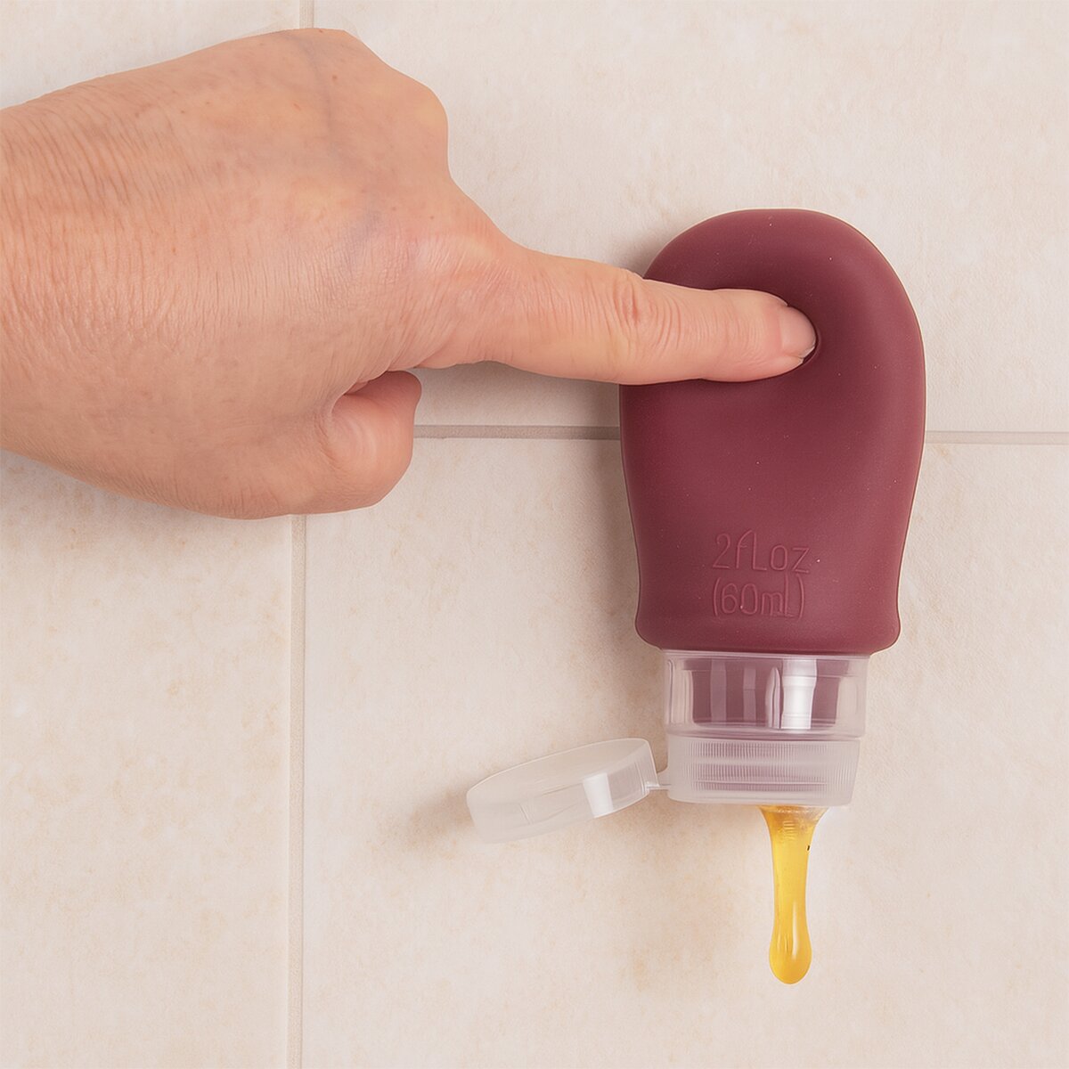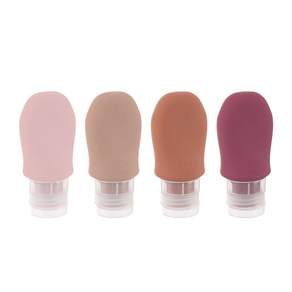 Lahvičky jsou vyrobeny ze silikonu, šroubovací víčka z plastu PP a jejich maximální objem nepřekračuje 60 ml. Splňují tedy kritéria pro příruční zavazadla v letadle.