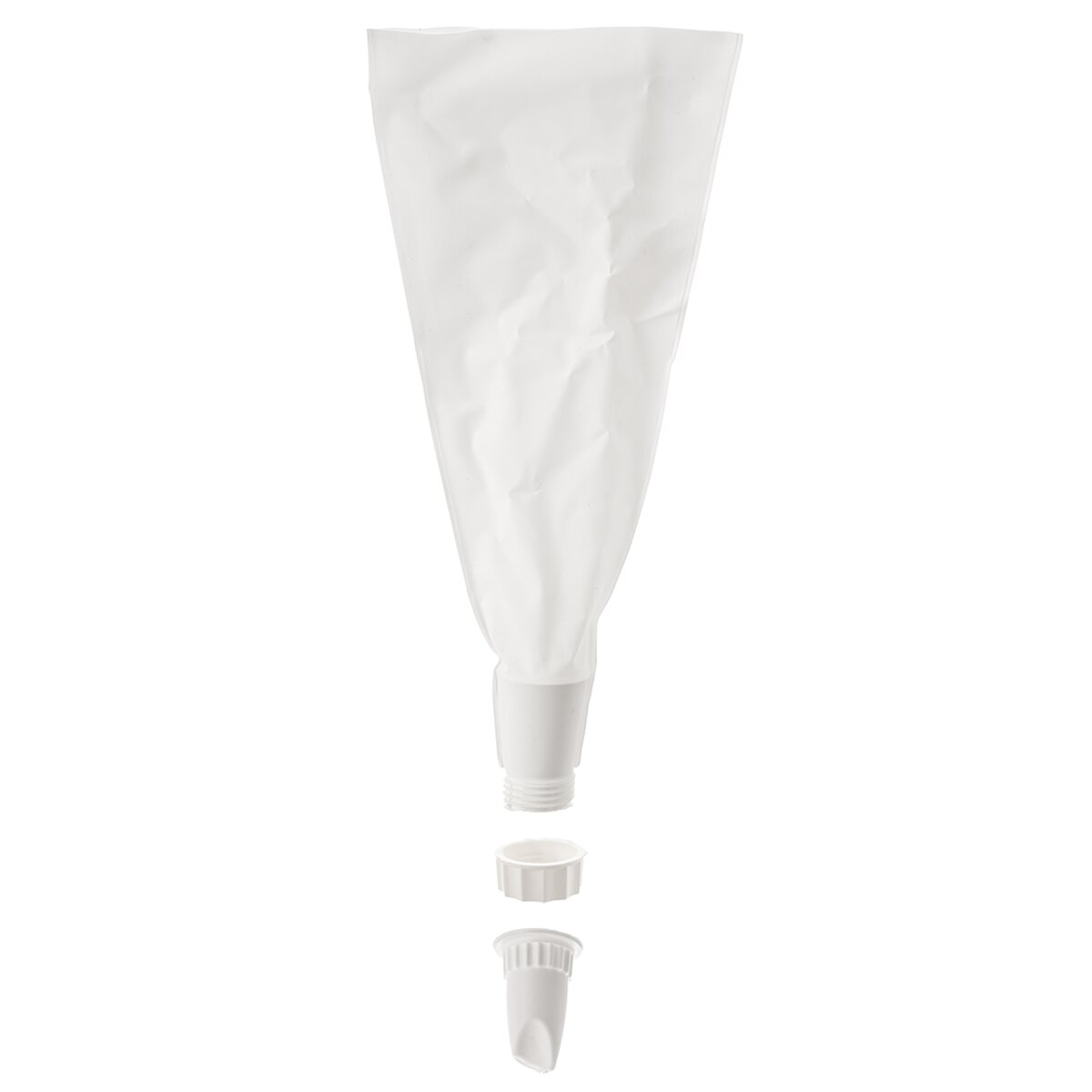 Sáček z PP a PVC plastu délky 32 cm je doplněn o 8 vyměnitelných špiček, které se díky závitu na jistícím kroužku snadno připevní. Mají kulaté a podélné otvory i klasickou hvězdu, vhodnou nejen při výrobě pusinek. Po použití stačí vše umýt v teplé vodě se saponátem.