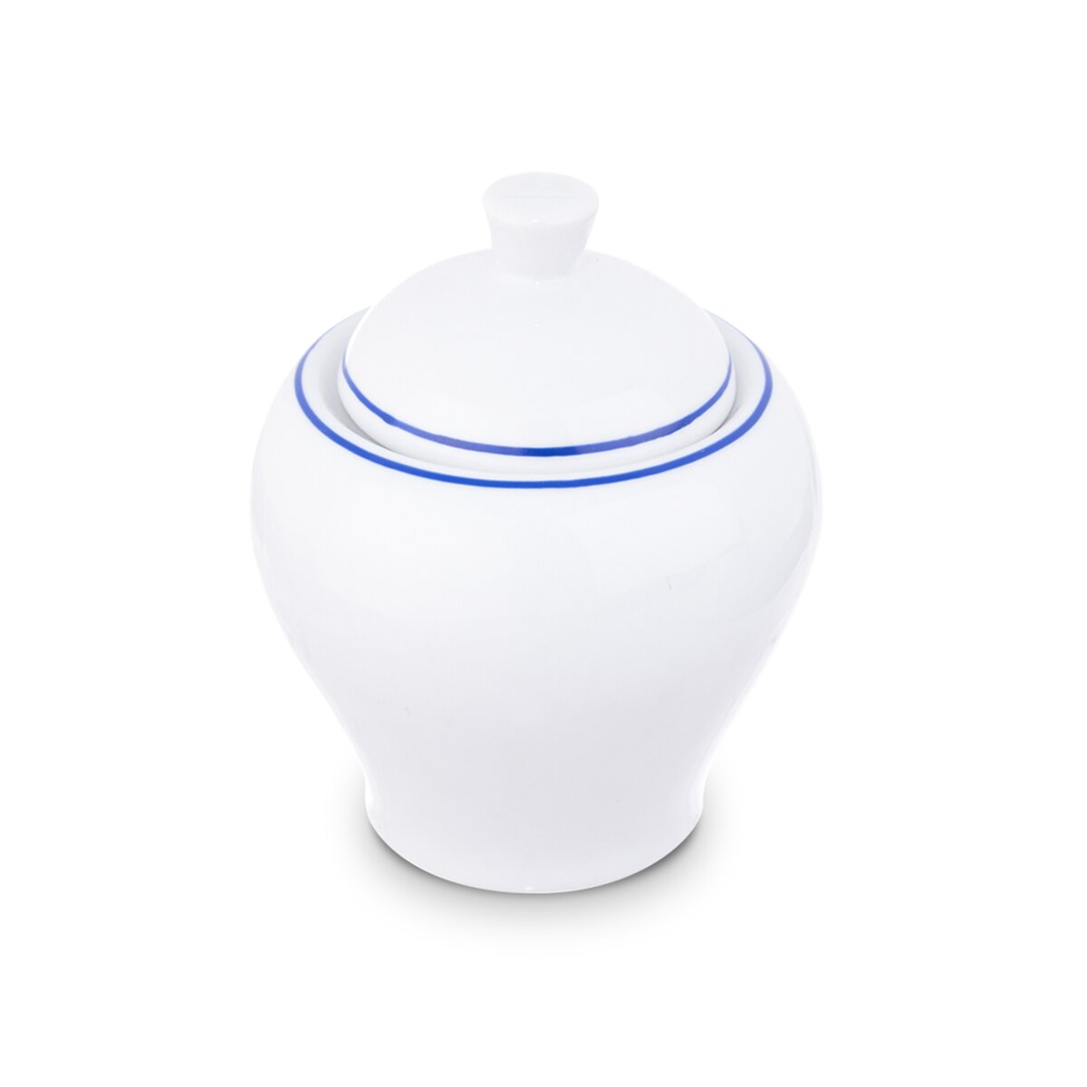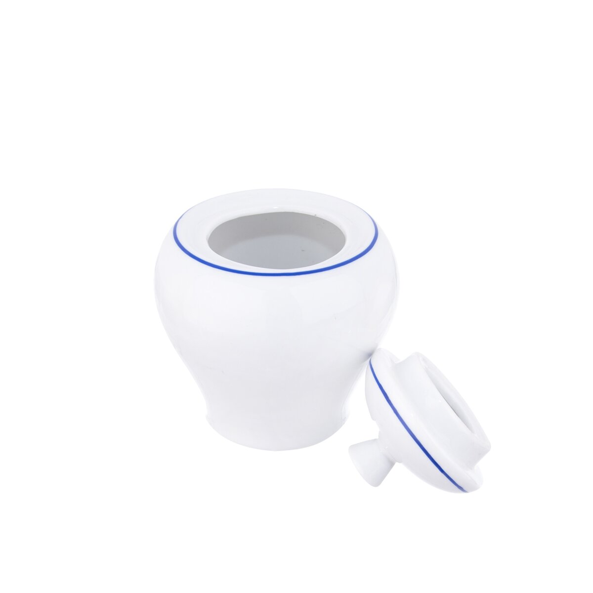 Kód produktu 126710Cukřenka s modrou linkou. Materiál: porcelán. Rozměry: 0,3 l, pr. 8 cm, v. 11 cm.