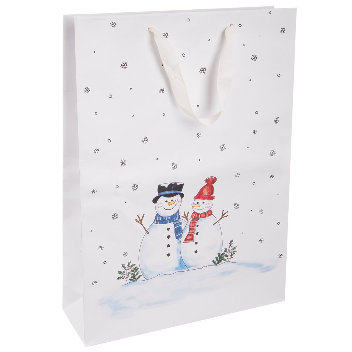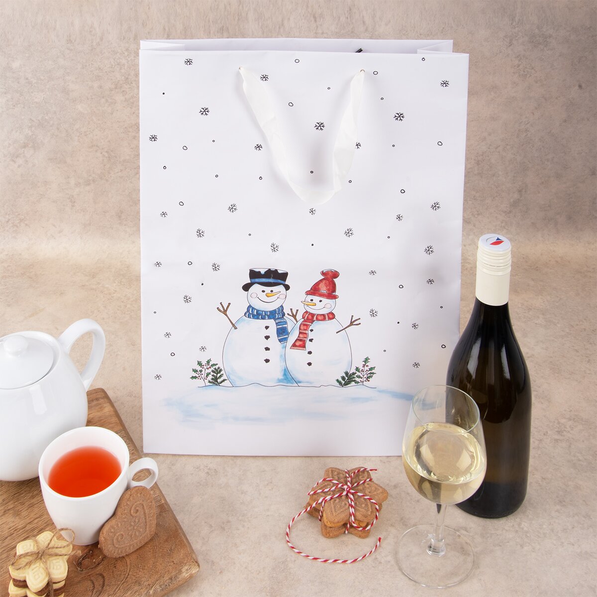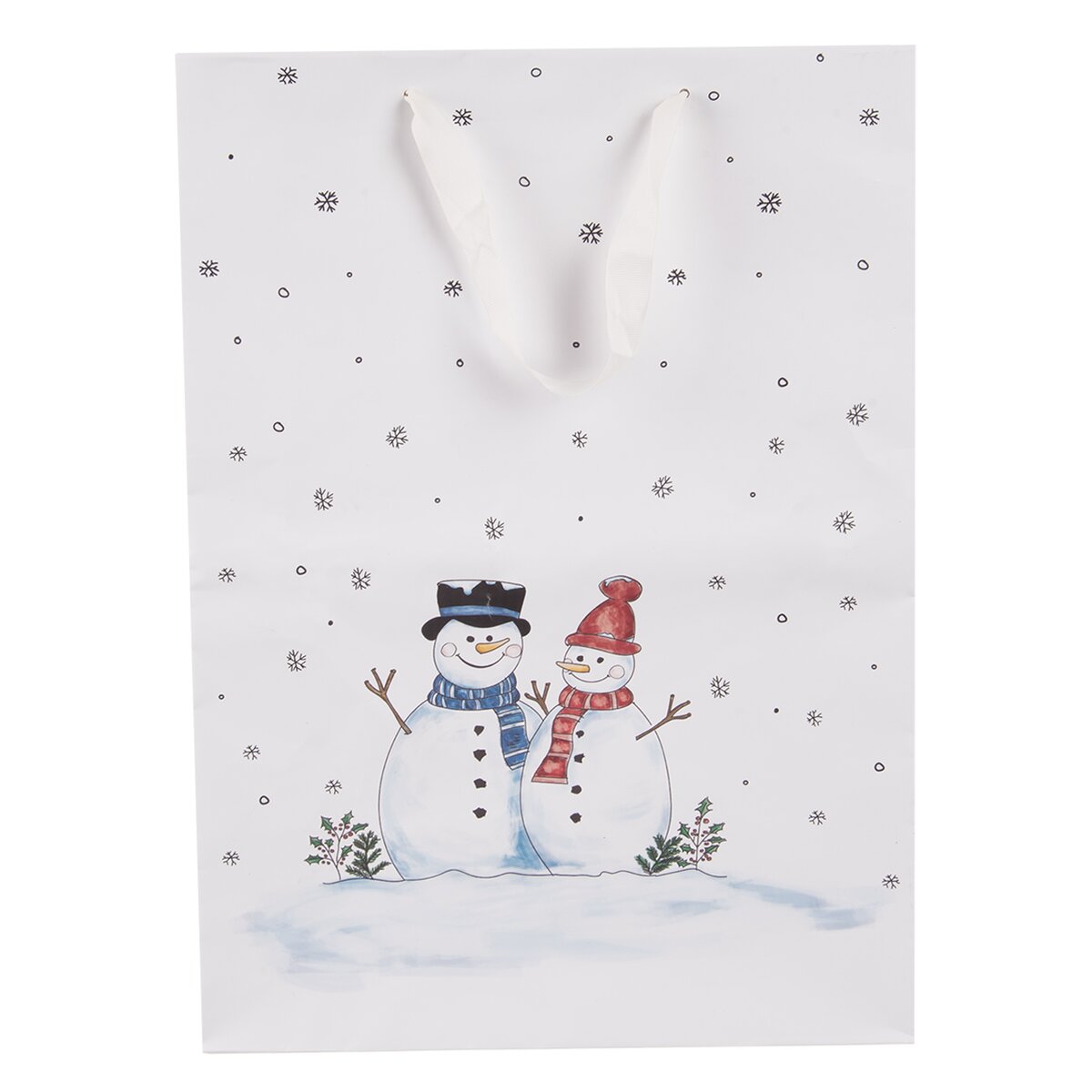 Kód produktu 822790Papírová dárková taška SNĚHULÁK o rozměrech 32,5x10x45,5 cm s milým motivem sněhuláků a padajících vloček je určena k uložení větších dárků.
