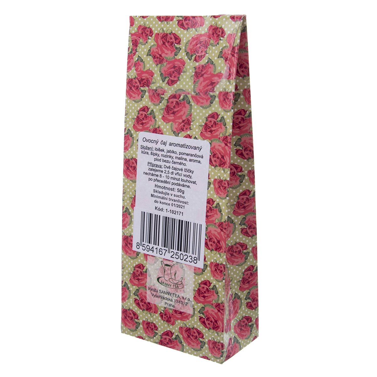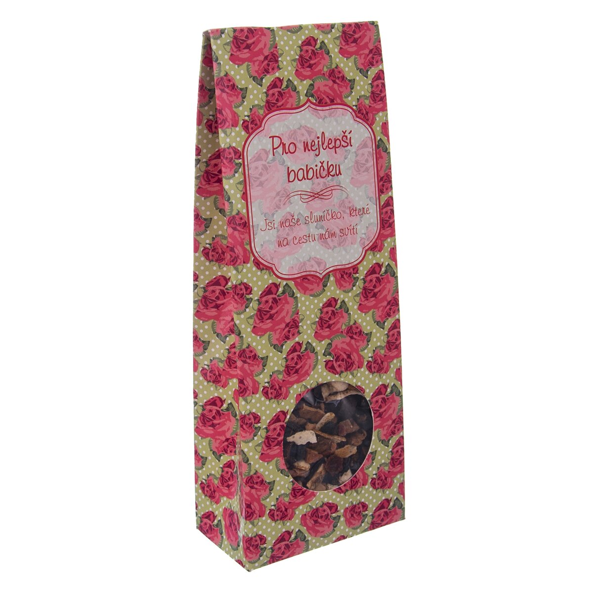 Ovocný aromatizovaný čaj v barevné krabičce s textem jako poděkování a potěšení obdarované osobě. 50 g. Rozměry obalu: 7x4x18,5 cm.