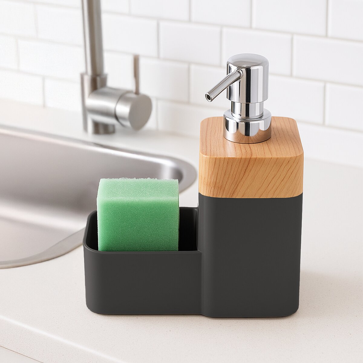 Dávkovač tekutého mýdla nebo saponátu na kuchyňskou linku je praktickým pomocníkem, který usnadňuje dávkování tekutých čisticích prostředků. Tento dávkovač obsahuje přihrádku na houbičku nebo drátěnku, které však nejsou součástí balení. Je ideální pro udržení pořádku a hygieny v kuchyni. Horní část nádoby má dekor imitující dřevo.