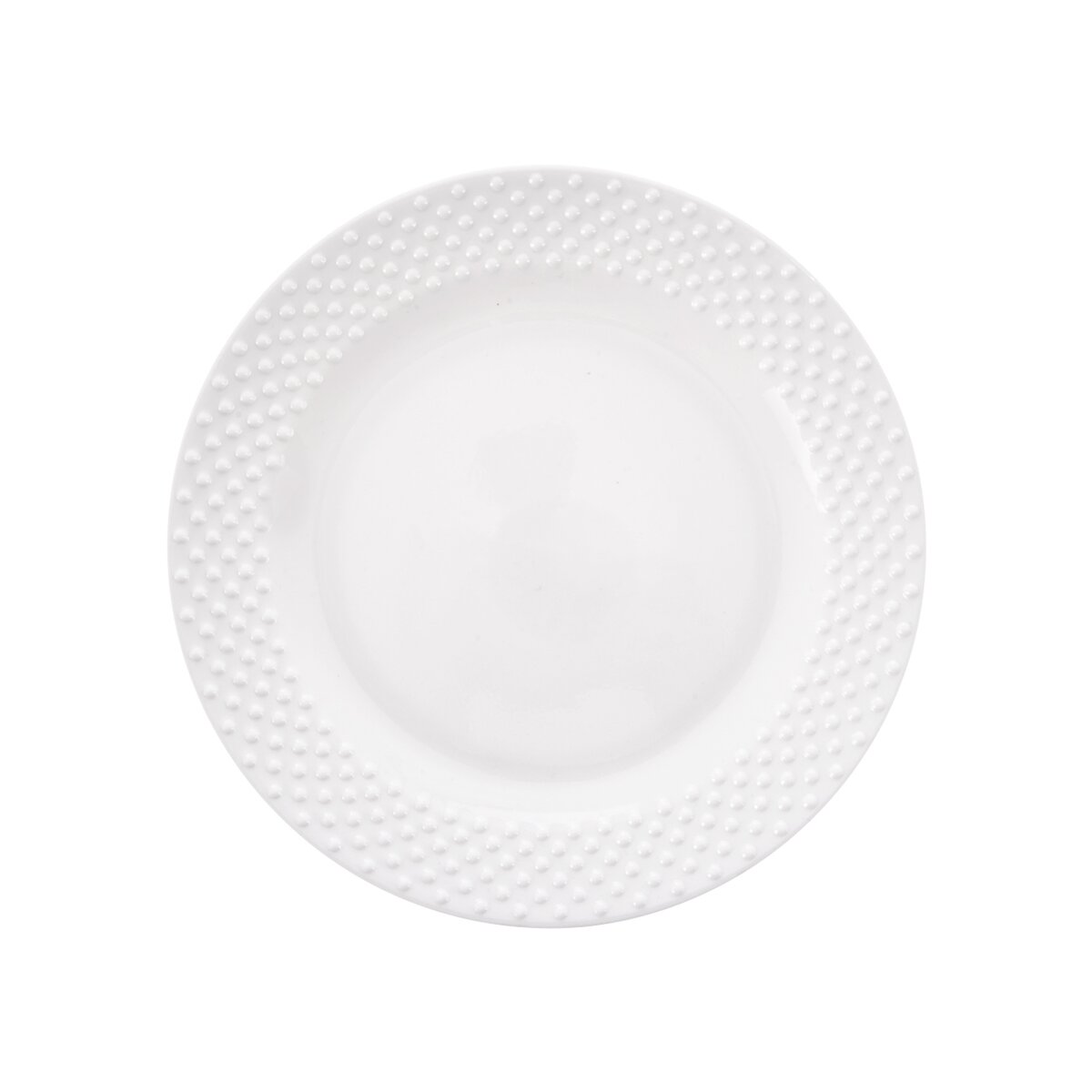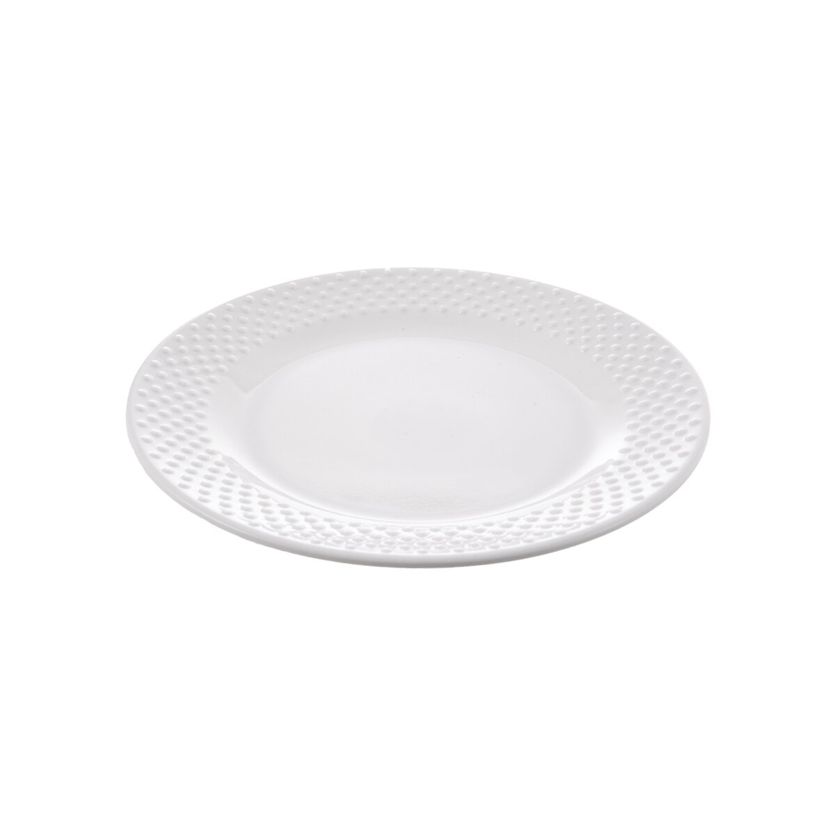 Kód produktu 129176Bílý dezertní melaminový talíř s drobný reliéfem po obvodu se hodí k podávání snídaně, svačiny, ovoce a dalšího občerstvení na zahradní párty, oslavě, na dovolené či v karavanu.