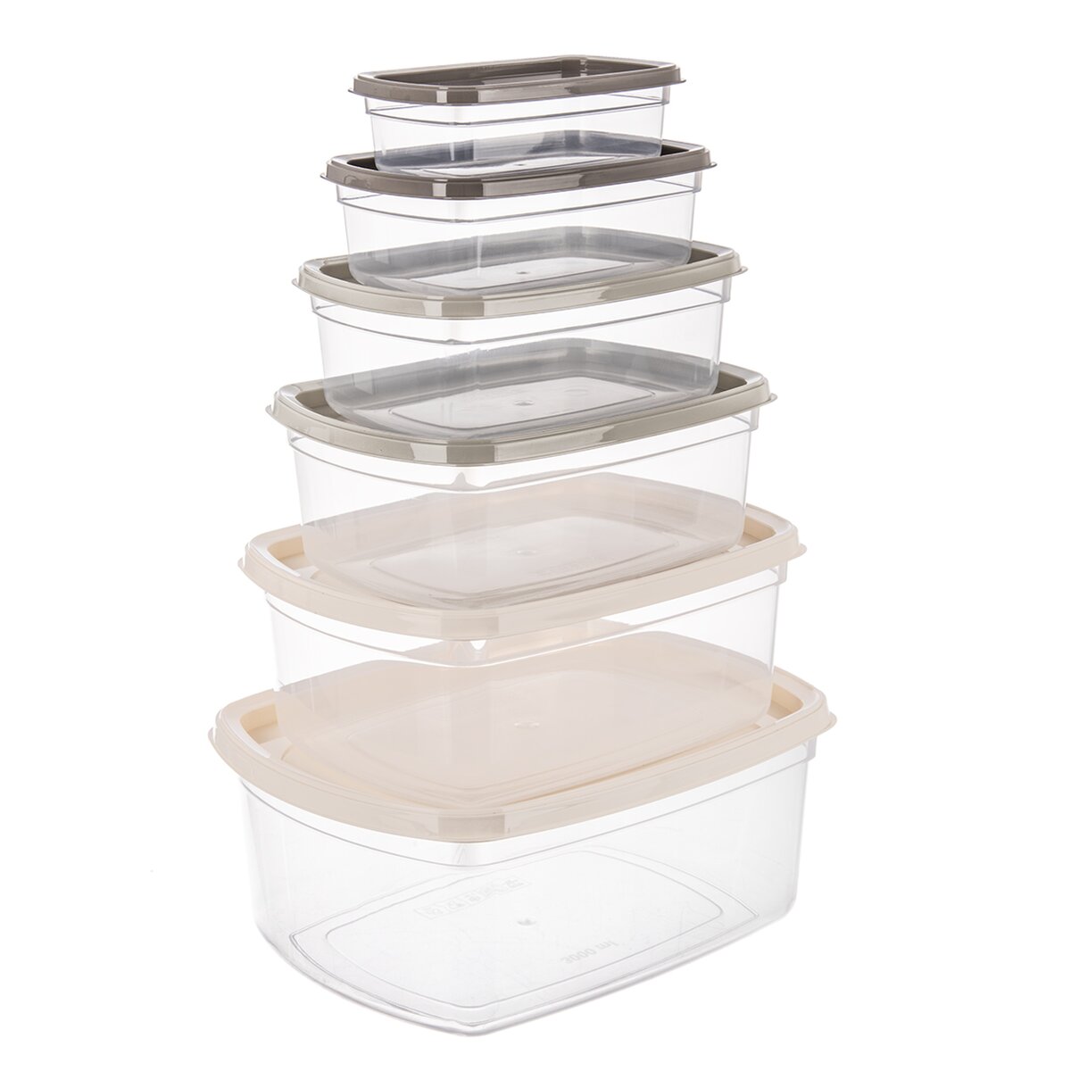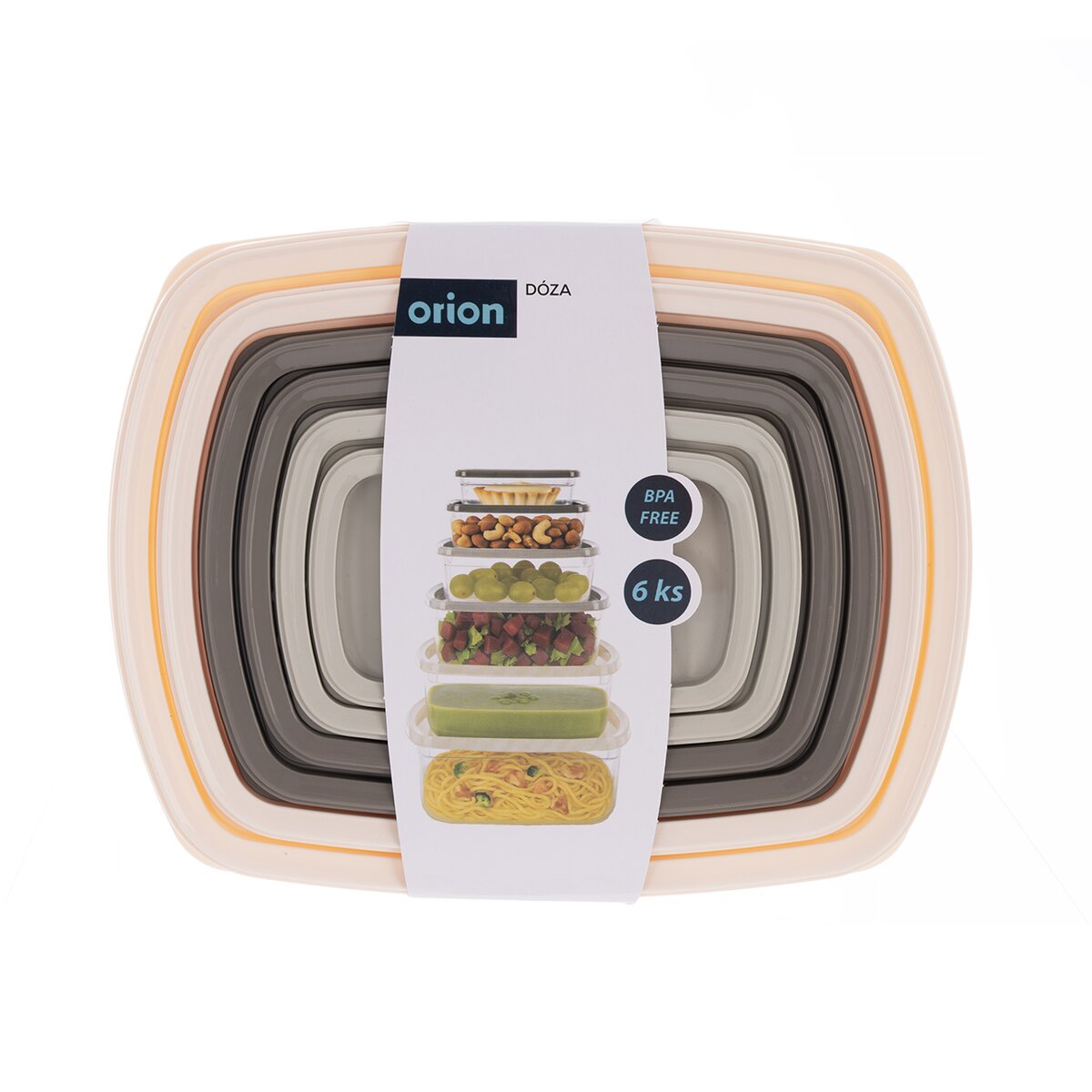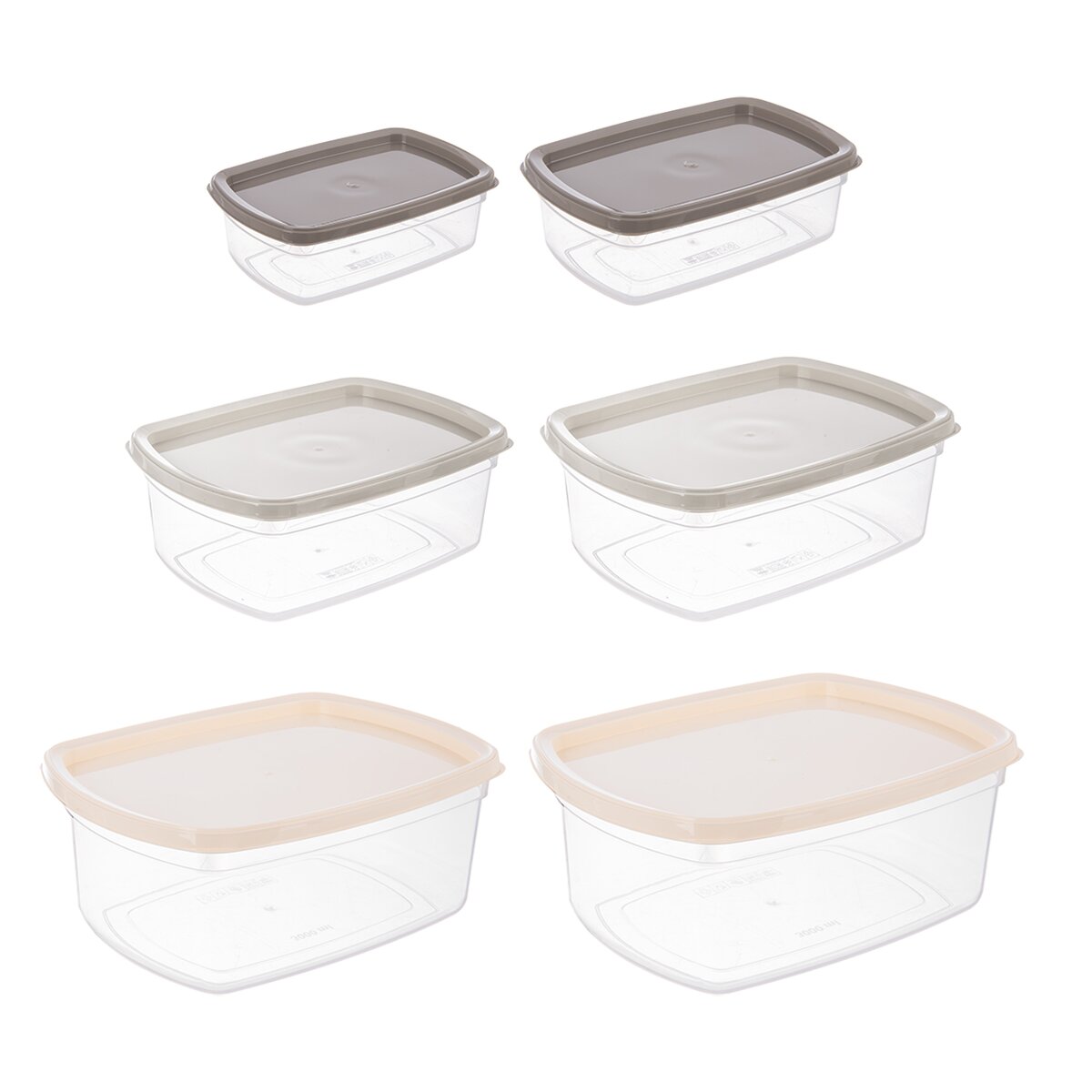 Kód produktu 154509Sada 6 transparentních obdélníkových dóz s víčky se hodí k uložení surovin pro vaření a pečení, k převážení hotových jídel do práce, na výlety, k uložený drobností v domácnosti. Mají objem 0,225 l, 0,43 l, 0,75 l, 1,22 l, 1,95 l a 3 l.
