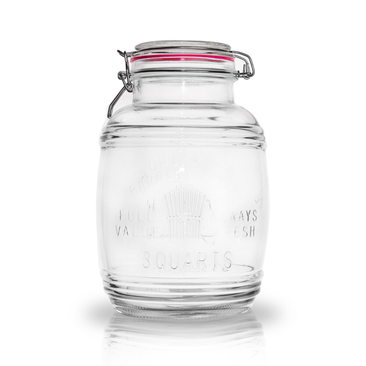 Kód produktu 126470Skleněná patentní dóza se silikonovým těsněním a drátěným uzávěrem má tvar soudku a objem 3 litry.