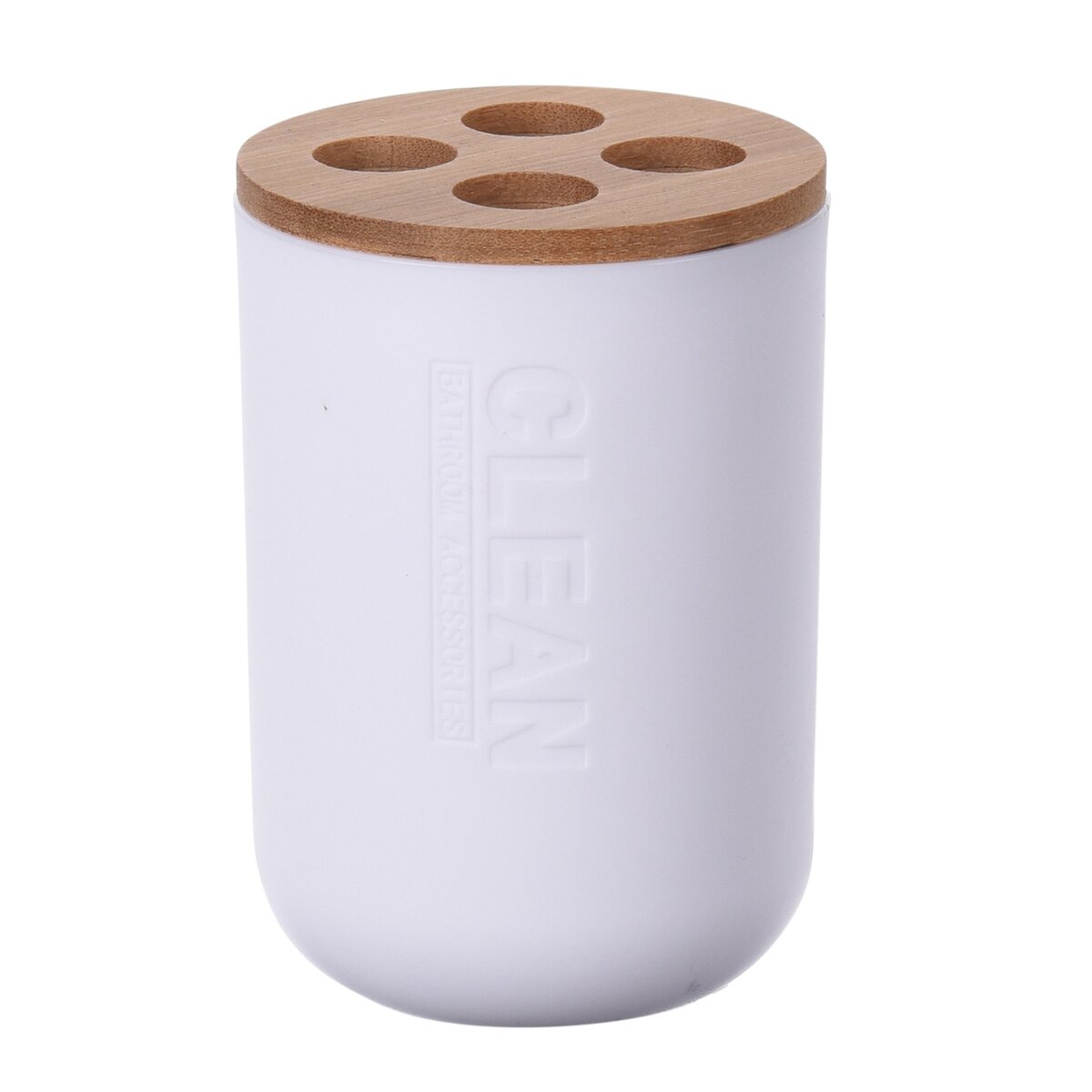 Kód produktu 531335Držák na zubní kartáčky. Materiál: plast, bambusové dřevo. Rozměry: o. 0,33 l, pr. 7 cm, v. 11 cm.