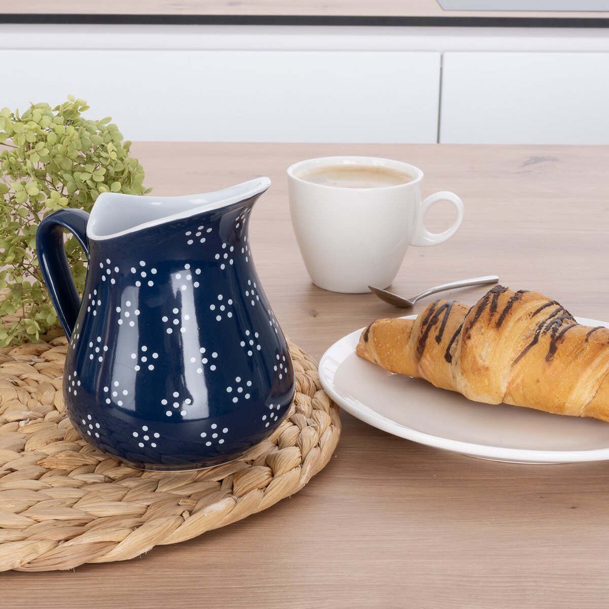 Keramický džbánek s bílými kvítky je praktický a zároveň stylový doplněk, který se skvěle hodí pro podávání mléka, smetany nebo domácích limonád. Jeho hravý design z něj dělá nejen funkční nádobu pro každodenní použití, ale i dekorativní prvek, který vynikne na jídelním stole, v kuchyni nebo třeba na polici. Výborně poslouží i jako originální váza na čerstvé nebo sušené květiny. Džbánek je vyroben z kvalitní keramiky. Jeho šířka s uchem je 13,5 cm.