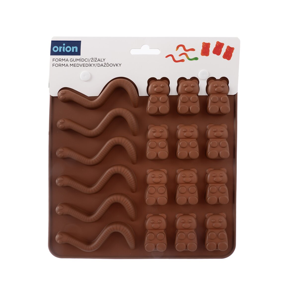 Kód produktu 151738Nepřilnavá hnědá silikonová forma pomůže s domácí výrobou želatinových bonbónů, oblíbených gumových medvídků a žížalek nebo čokoládových pralinek.
