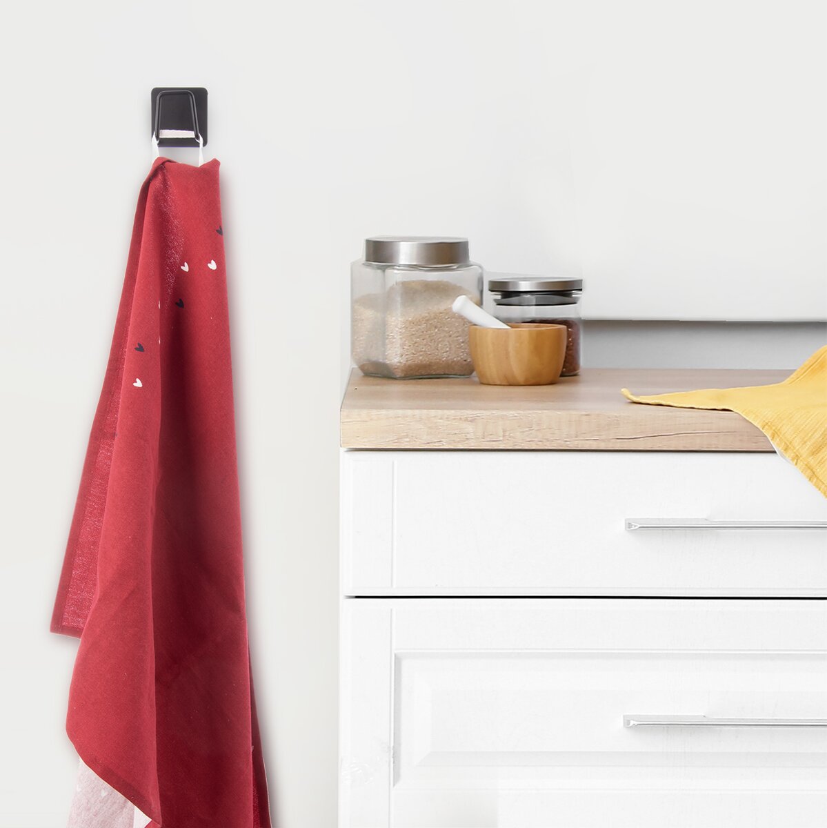 Kód produktu 532092Sada 2 kusů kovových nalepovacích háčků je vhodná k zavěšení utěrek, ručníků a dalších drobnějších textilií, ale lze do ní umístit houbičku na mytí nádobí, takže bude u kuchyňského dřezu po ruce a dostatečně proschne.