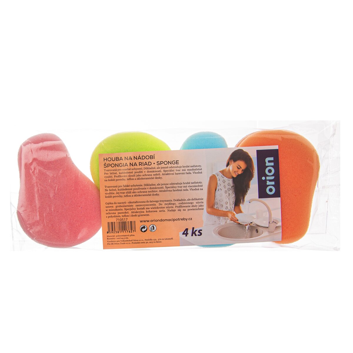 Sada čtyř kusů houbiček na nádobí je vyrobená z polyuretanové pěny, na jejímž spodu je neškrábavý vlies. Díky tomu důkladně, ale šetrně odstraňuje hrubé nečistoty.
