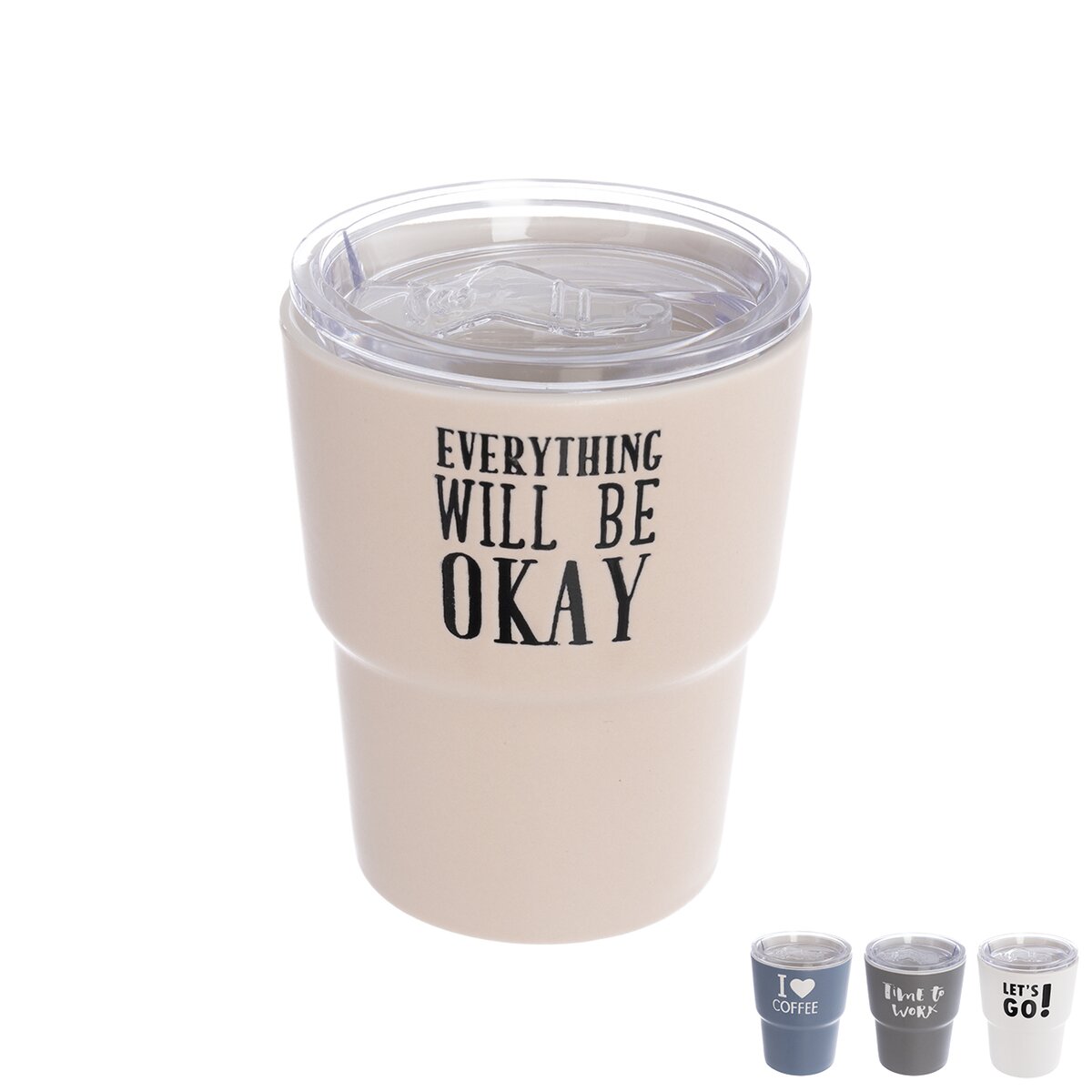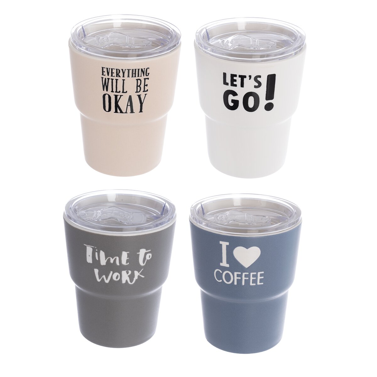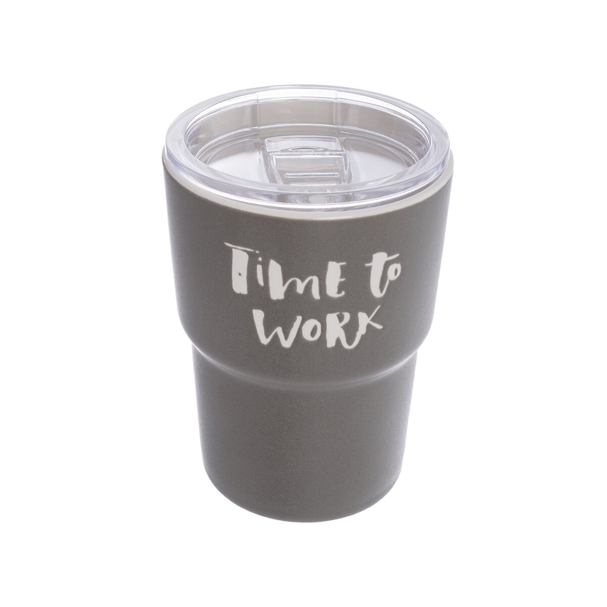Kód produktu 112458Porcelánový hrnek o objemu 0,38 l je uzavřen průhledným víčkem s těsněním a z přední strany je zdoben trefnými nápisy. Hodí se k přenášení teplých i studenách nápojů, a to nejen do práce.