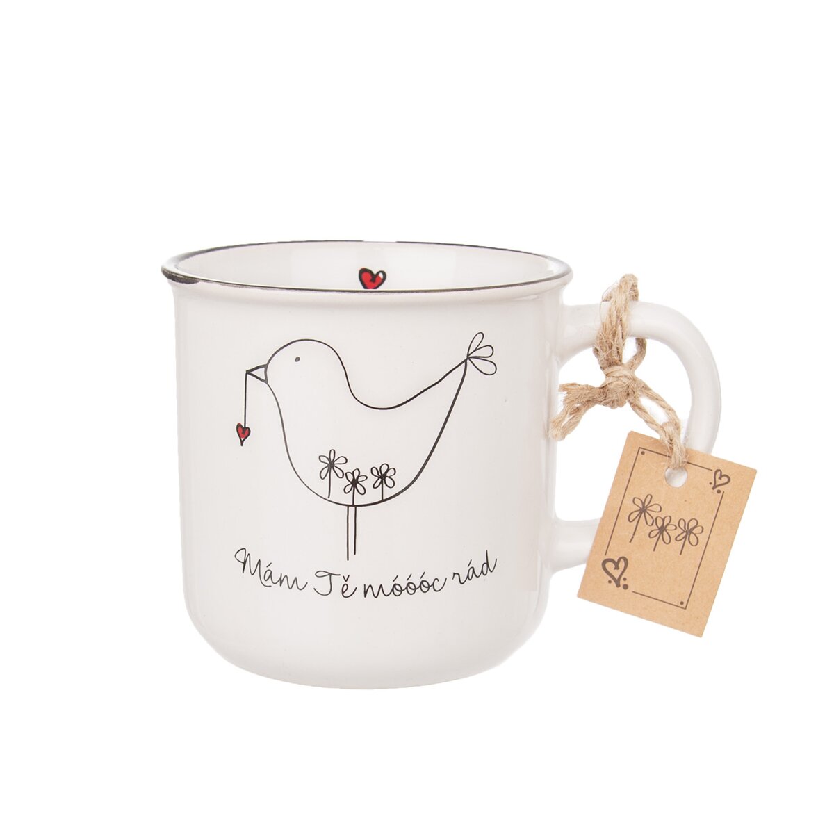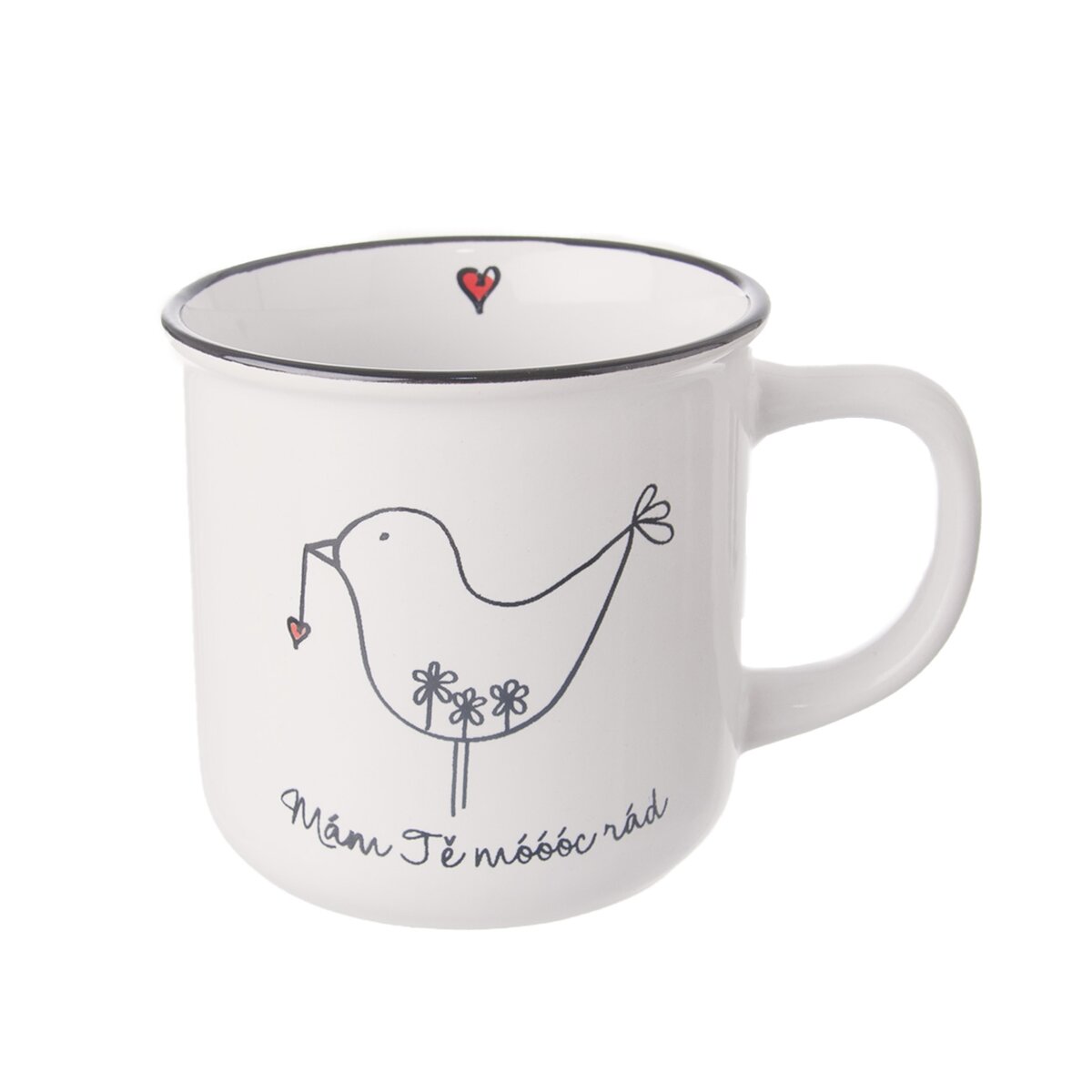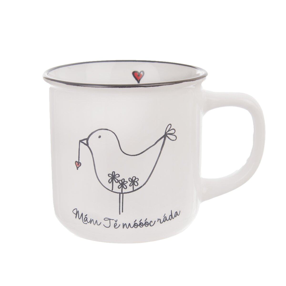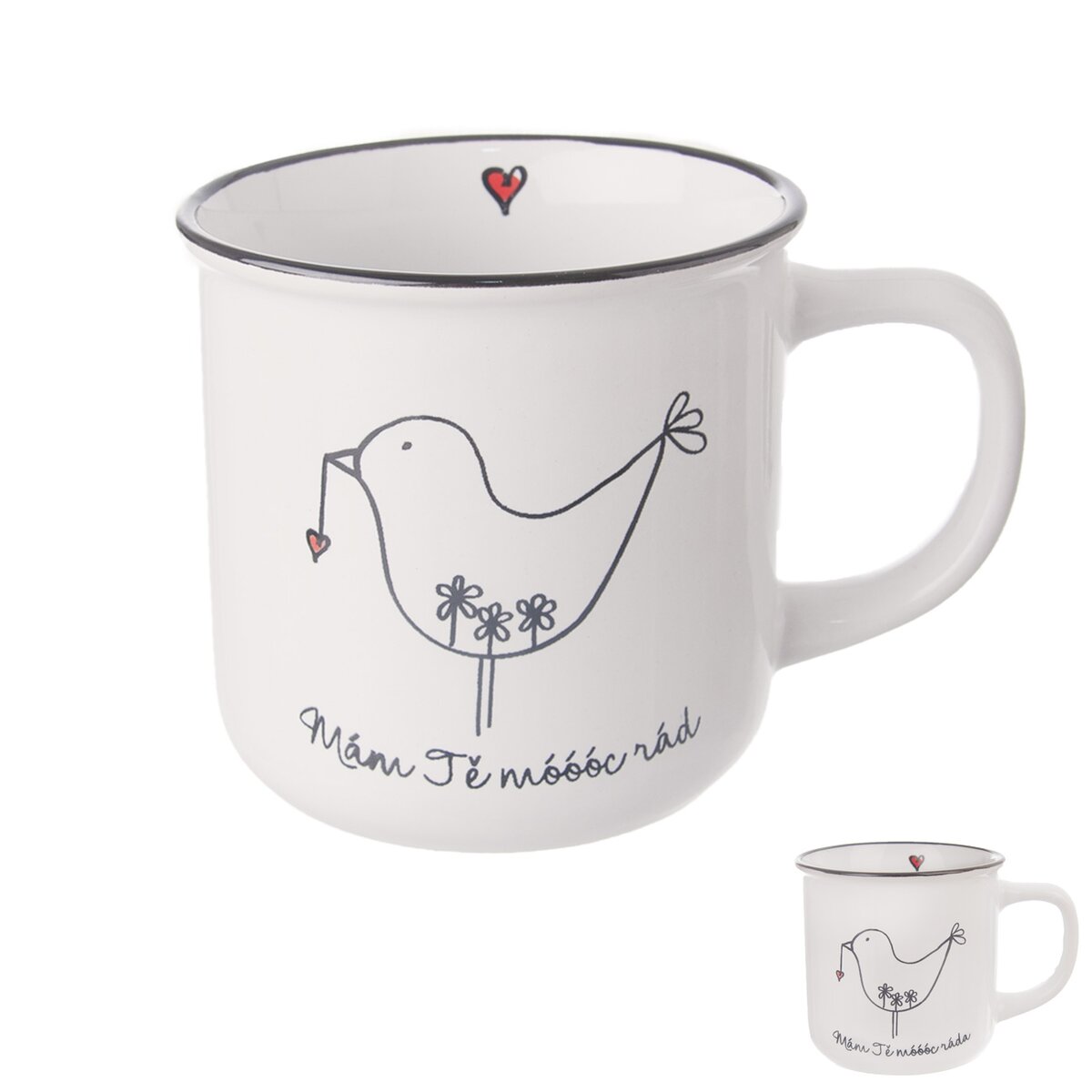 Kód produktu 128815Keramický hrnek o objemu 0,37 l s dekorem ptáčka a nápisem MÁM TĚ RÁD/A.