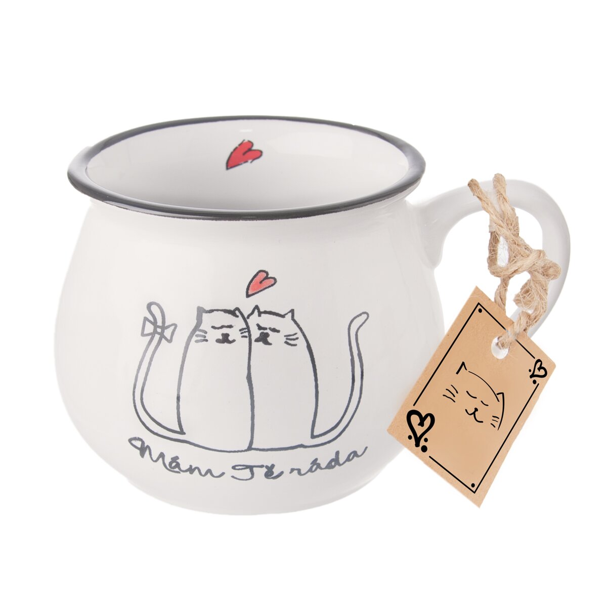 Řekněte to hrnkem. Ať už je Den matek, svátek zamilovaných nebo sháníte dárek k narozeninám, potěšte svou blízkou osobu tímto keramickým bucláčkem s dekorem dvou tulících se koček a nápisem MÁM TĚ RÁD nebo RÁDA.