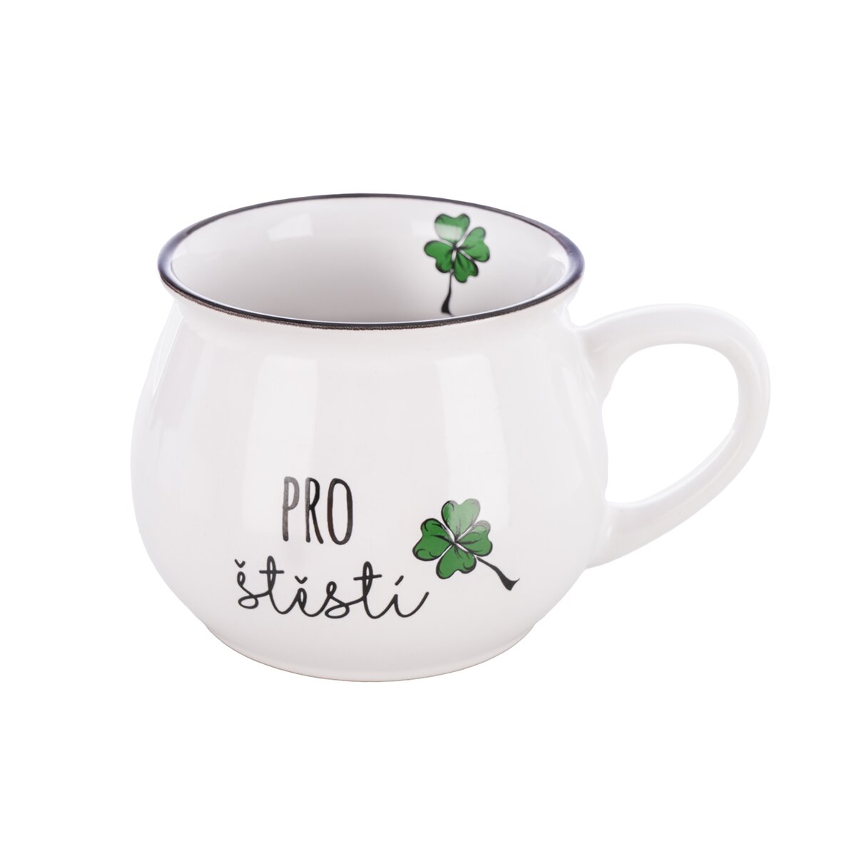 Kód produktu 132223Baculatý keramický hrnek o objemu 300 ml zdobí nápis "Pro štěstí" a je určen k podávání teplých i studených nápojů.