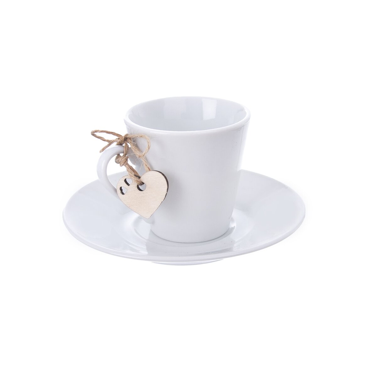 Hrnek s uchem, podšálek a přívěsek. Materiál: porcelán, dřevo. Barva bílá. Rozměry: objem 0,09 l, pr. š. 6 cm, pr. podš. 12 cm, přívěsek 2,5x2,5 cm.