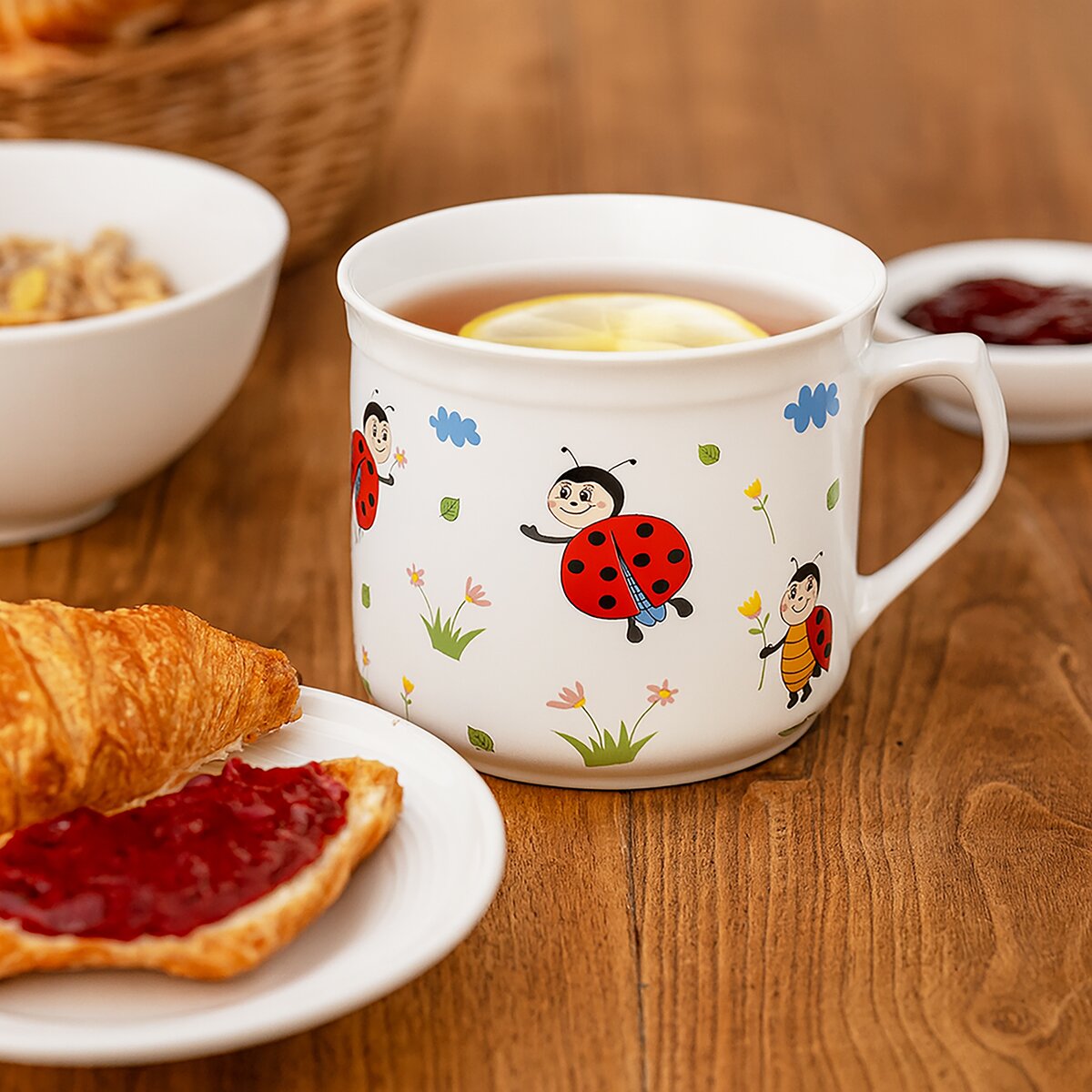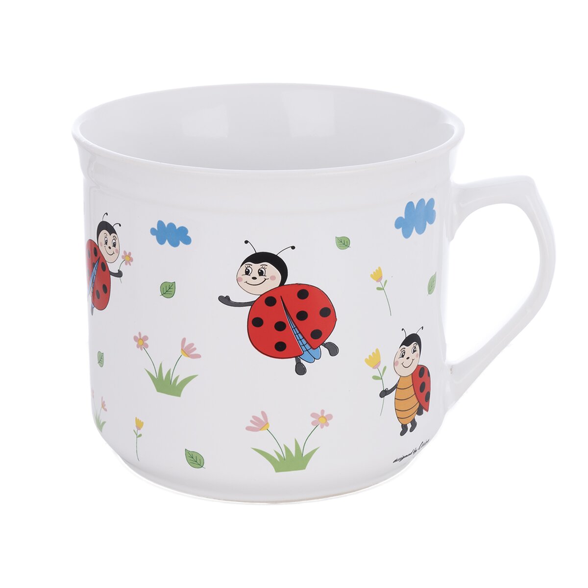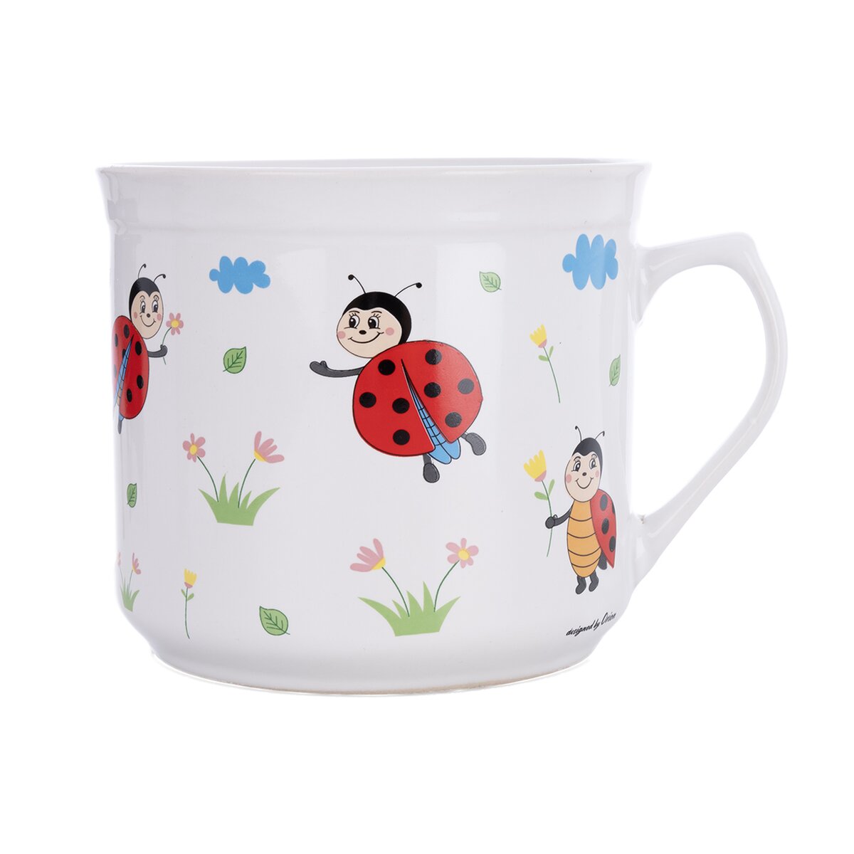 Kód produktu 132241Bílý keramický hrnek - vařák s motivem roztomilých berušek z vnější strany má užitný objem 500 ml a hodí se k podávání čaje, kakaa i polévky.