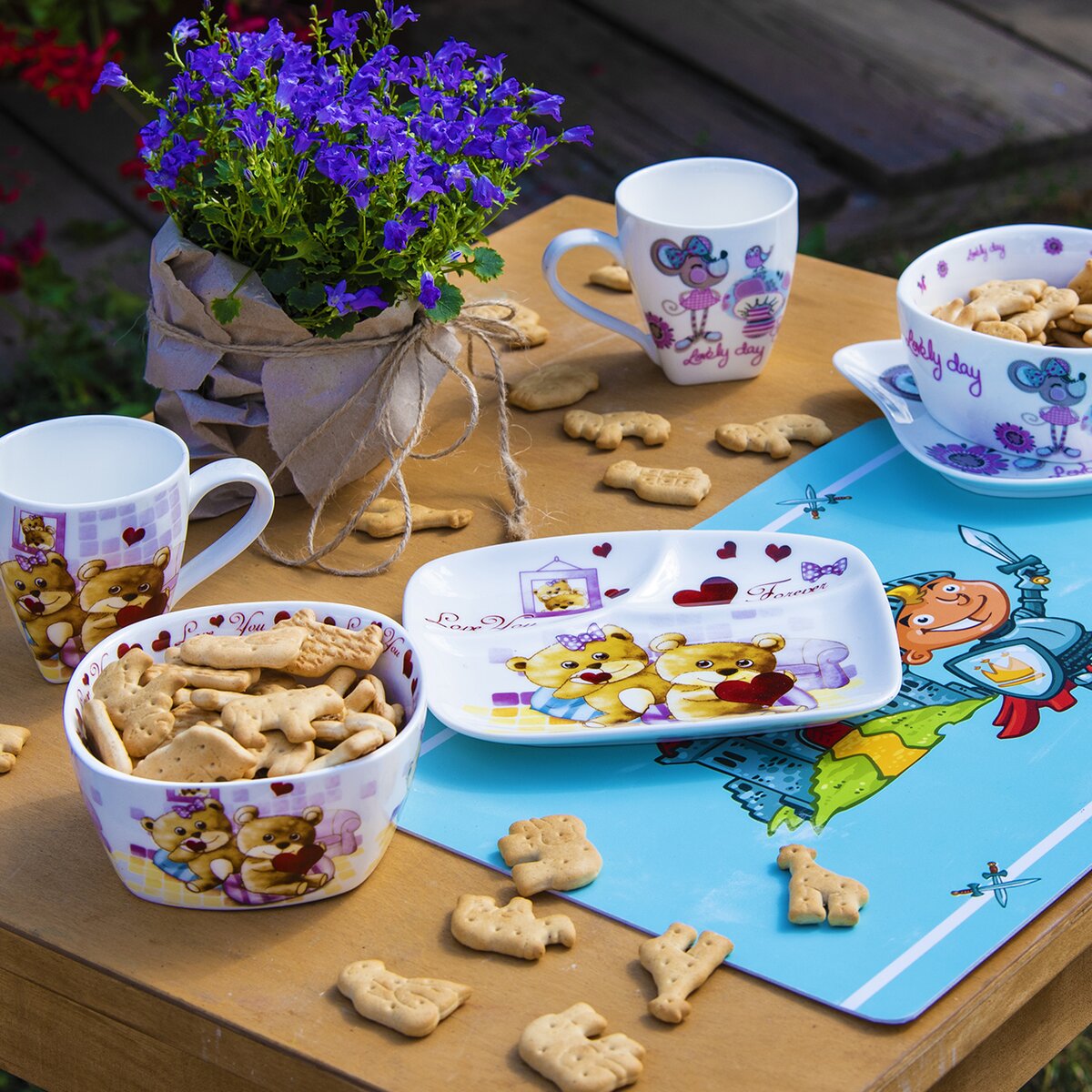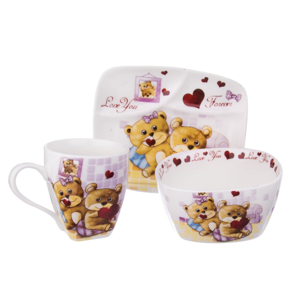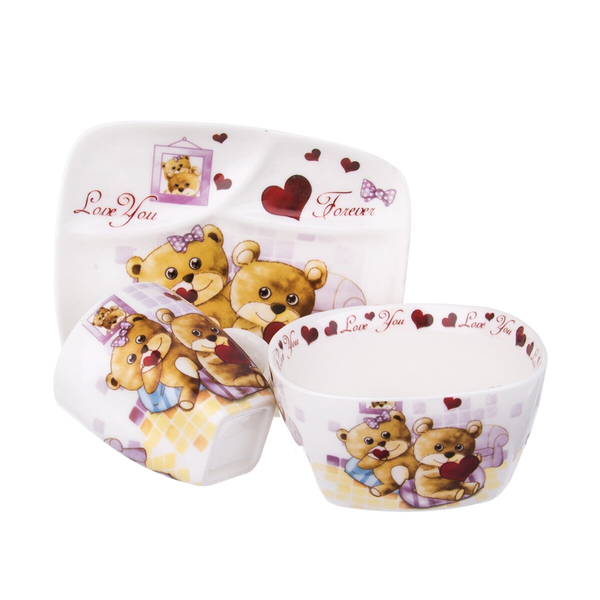 Sada jídelní porcelánová s dekorem MEDVÍDKŮ potěší vaše děti. Sada obsahuje hrneček, mističku a mělký hranatý talířek. Dárkové balení. Materiál: porcelán. Rozměry: hrneček - 0,2 l, pr. 7 cm, v. 8 cm, mistička – 12x12x5,5 cm, talířek – 17x14,5 cm. Nádobí lze mýt v myčce na nádobí a používat v mikrovlnné troubě.