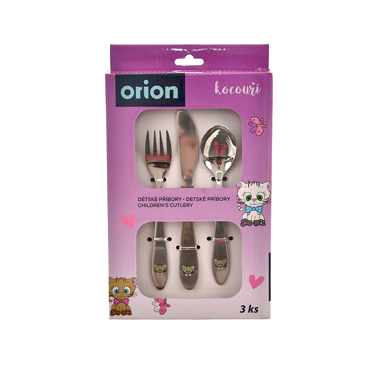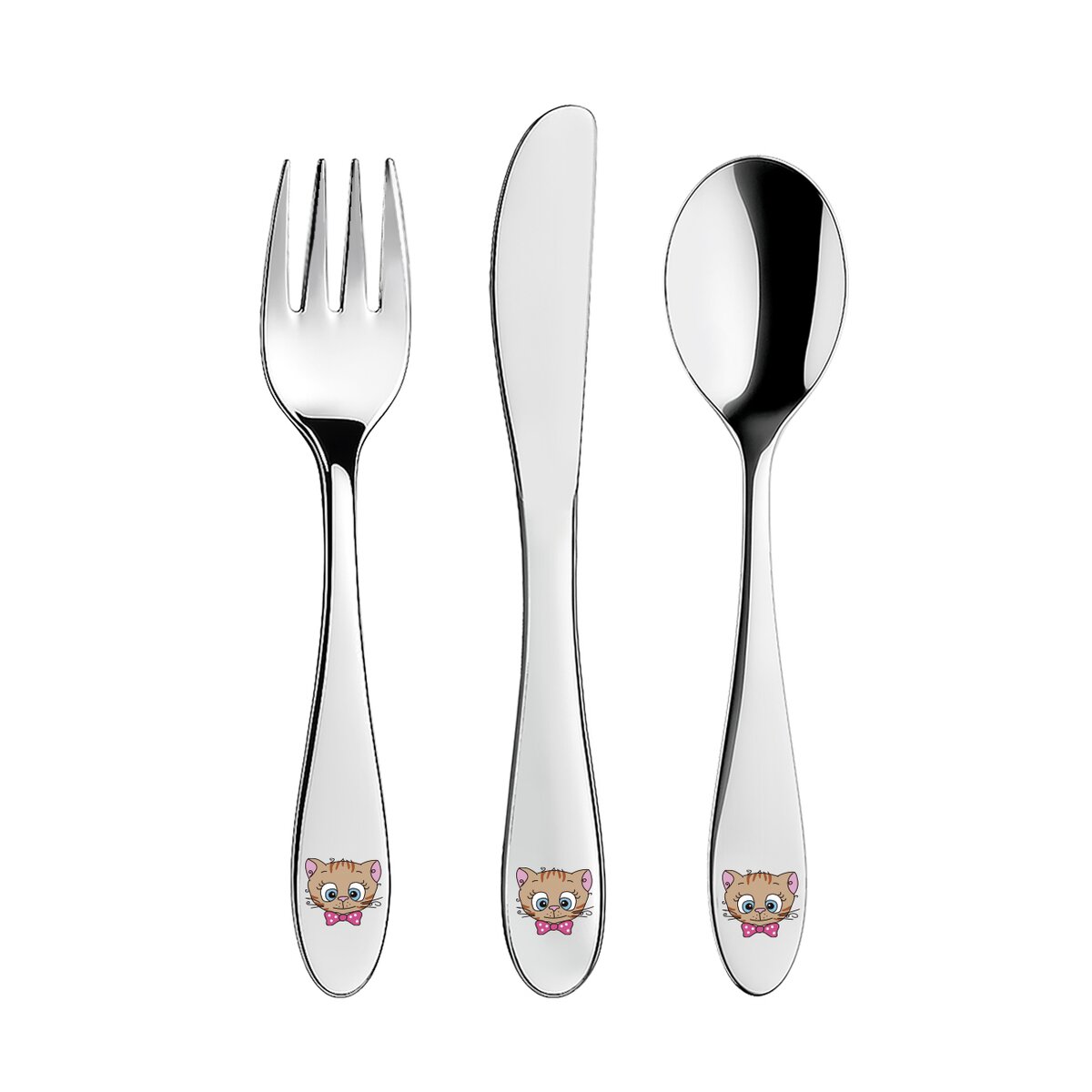 Kód produktu 143700Set dětských nerezových příborů s barevným motivem roztomilého kocourka obsahuje lžíci, vidličku a nůž a je určen pro každodenní používání.