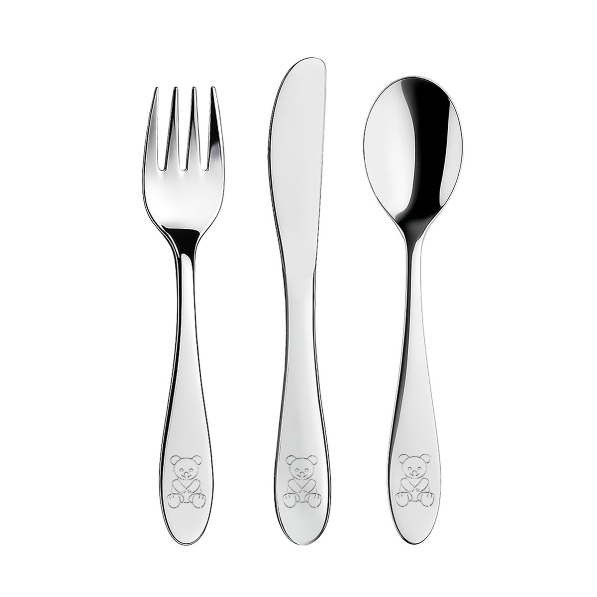 Kód produktu 143682Set dětských nerezových příborů s rytým motivem medvídka obsahuje lžíci, vidličku a nůž a je určen pro každodenní používání.