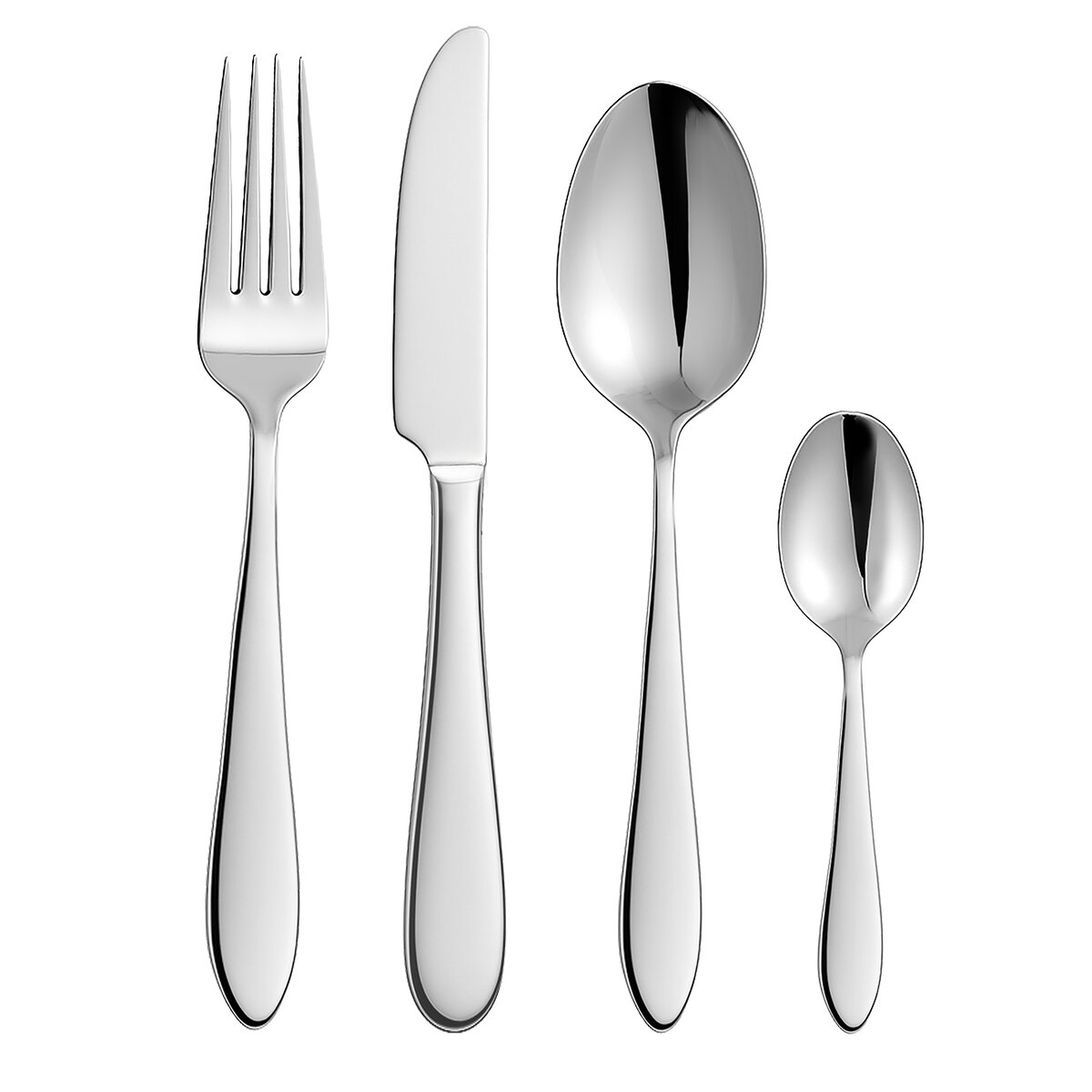 Lesklé nerezové příbory v jednoduchém, minimalistickém designu a elegantní zaoblenou spodní částí, která se příjemně drží v ruce.