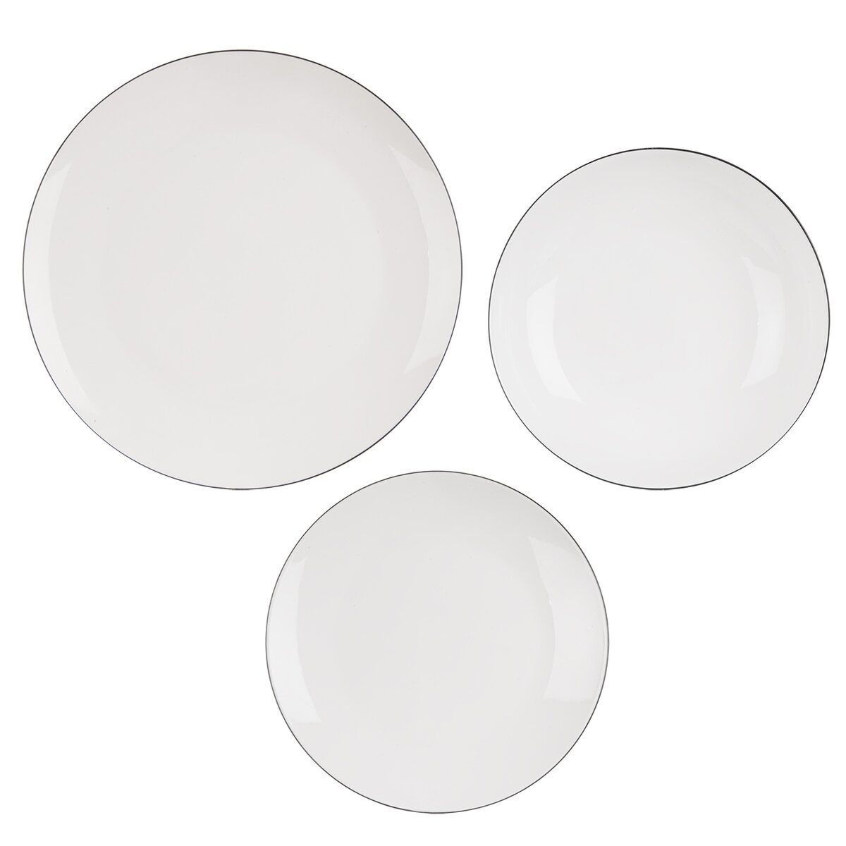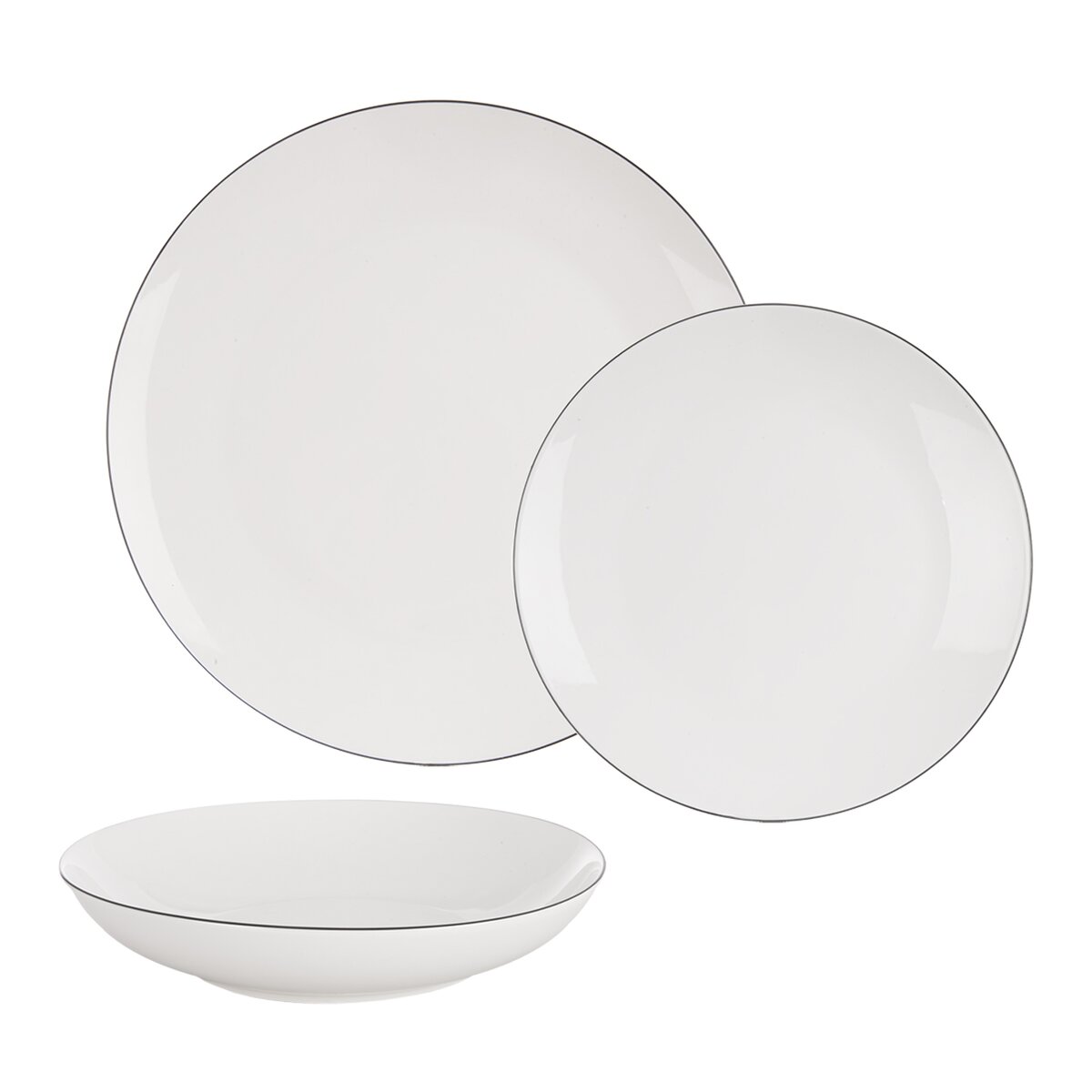 Kód produktu 129599Jídelní sada DECORA z bílého porcelánu zdobeného tenkou černou linkou po obvodu obsahuje 6 dezertních, 6 hlubokých a 6 mělkých talířů. Hodí se pro každodenní i sváteční stolování.