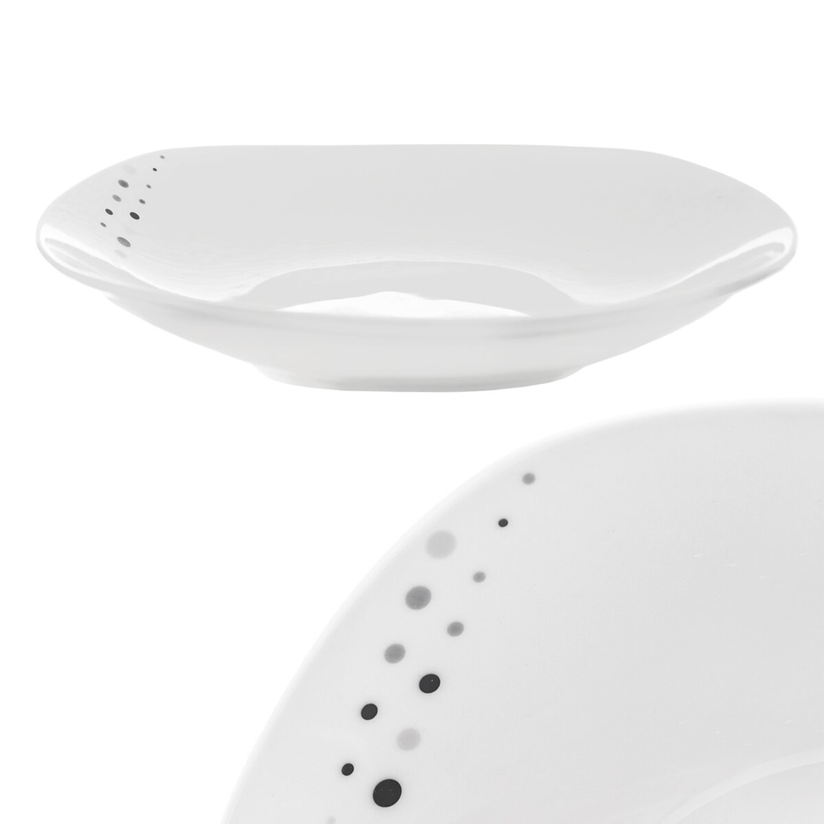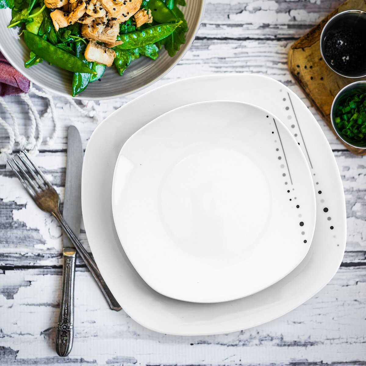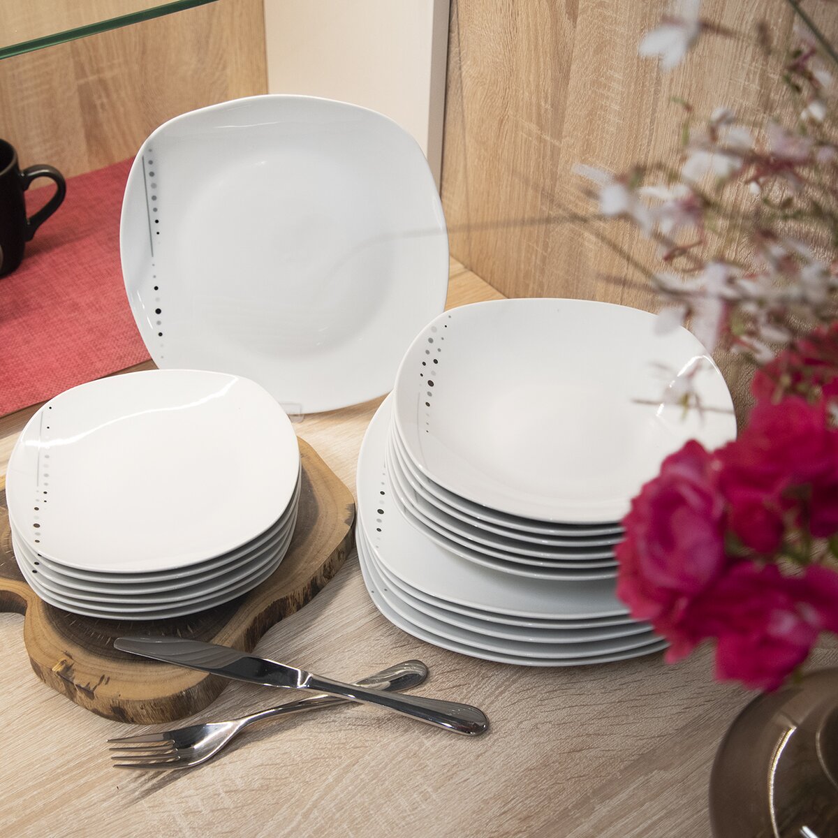 Kód produktu 112353Jídelní porcelánová sada se skládá z 6 hranatých dezertních, 6 mělkých a 6 hlubokých talířů s jemným geometrickým dekorem, minimalistickými šedo-černými body a čárami.