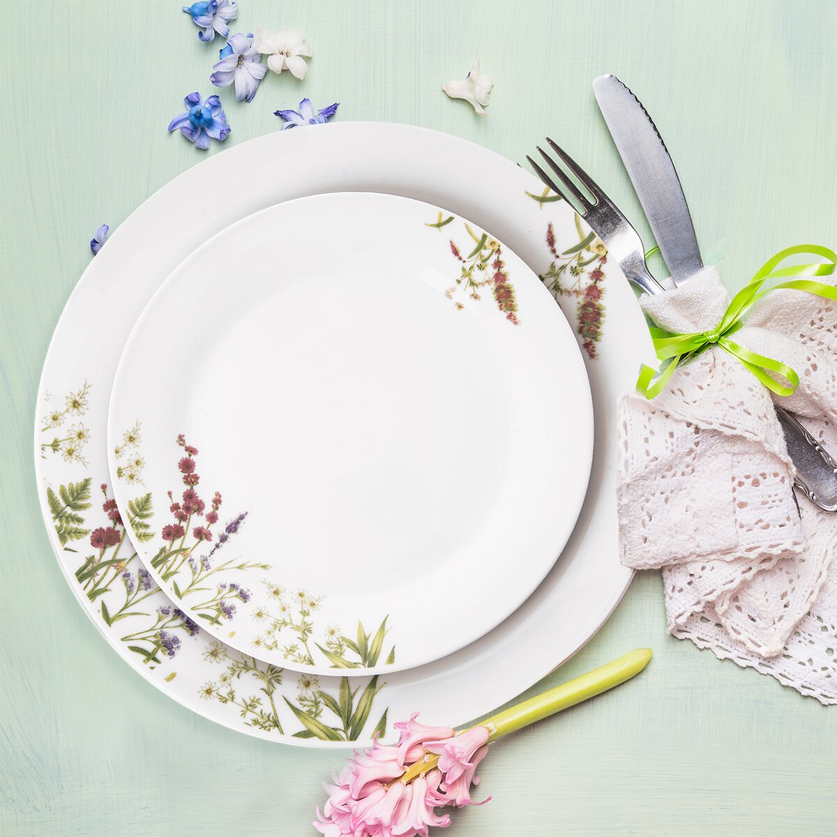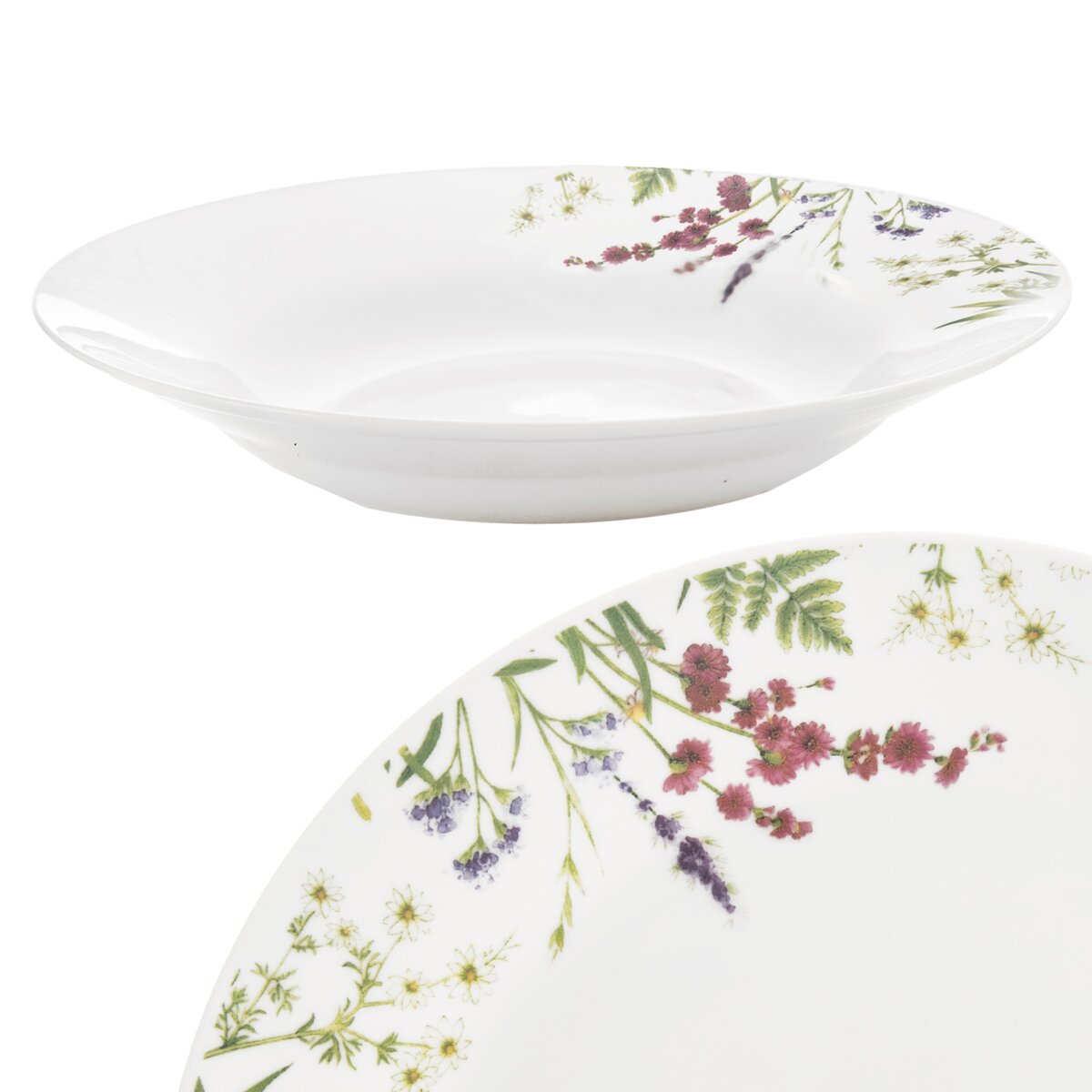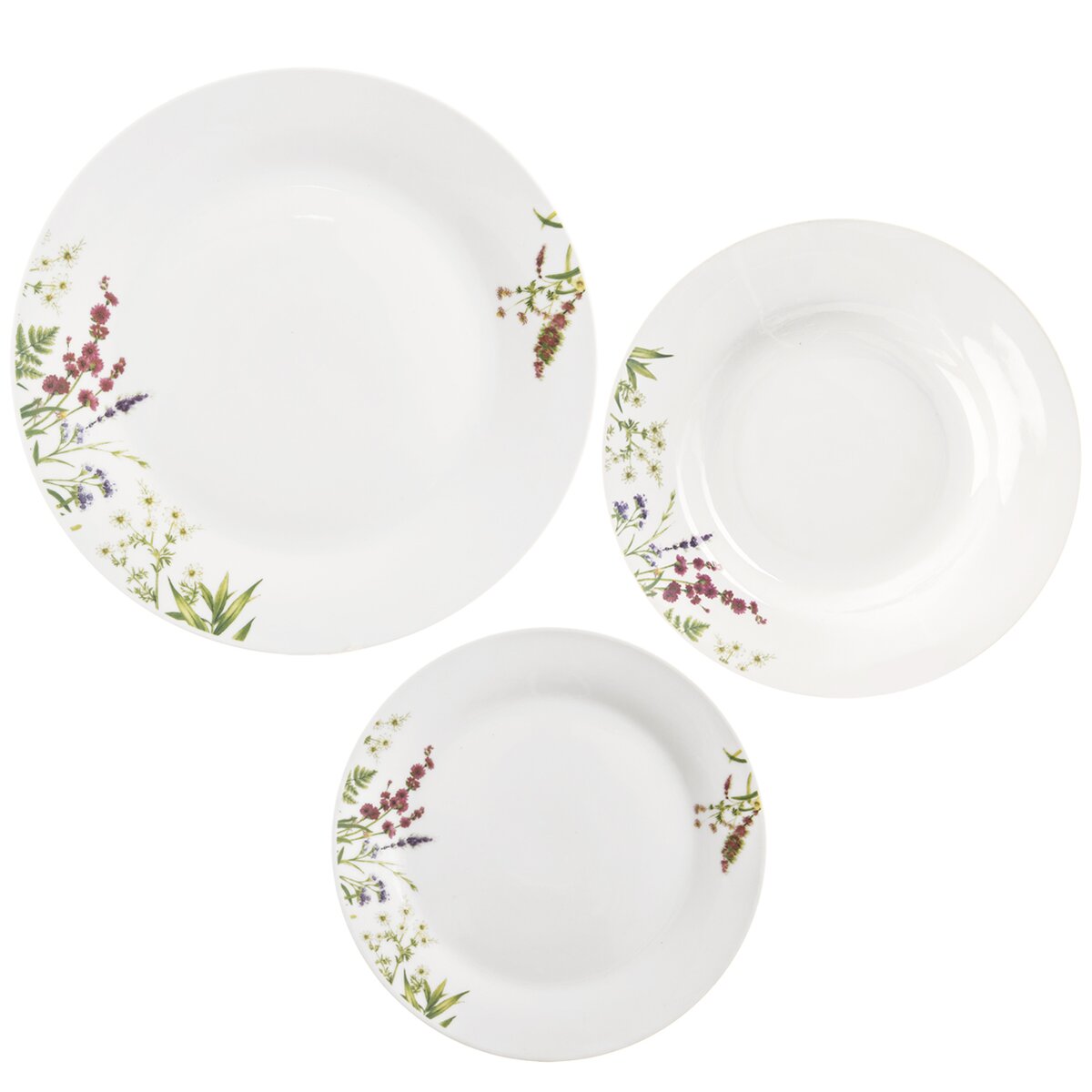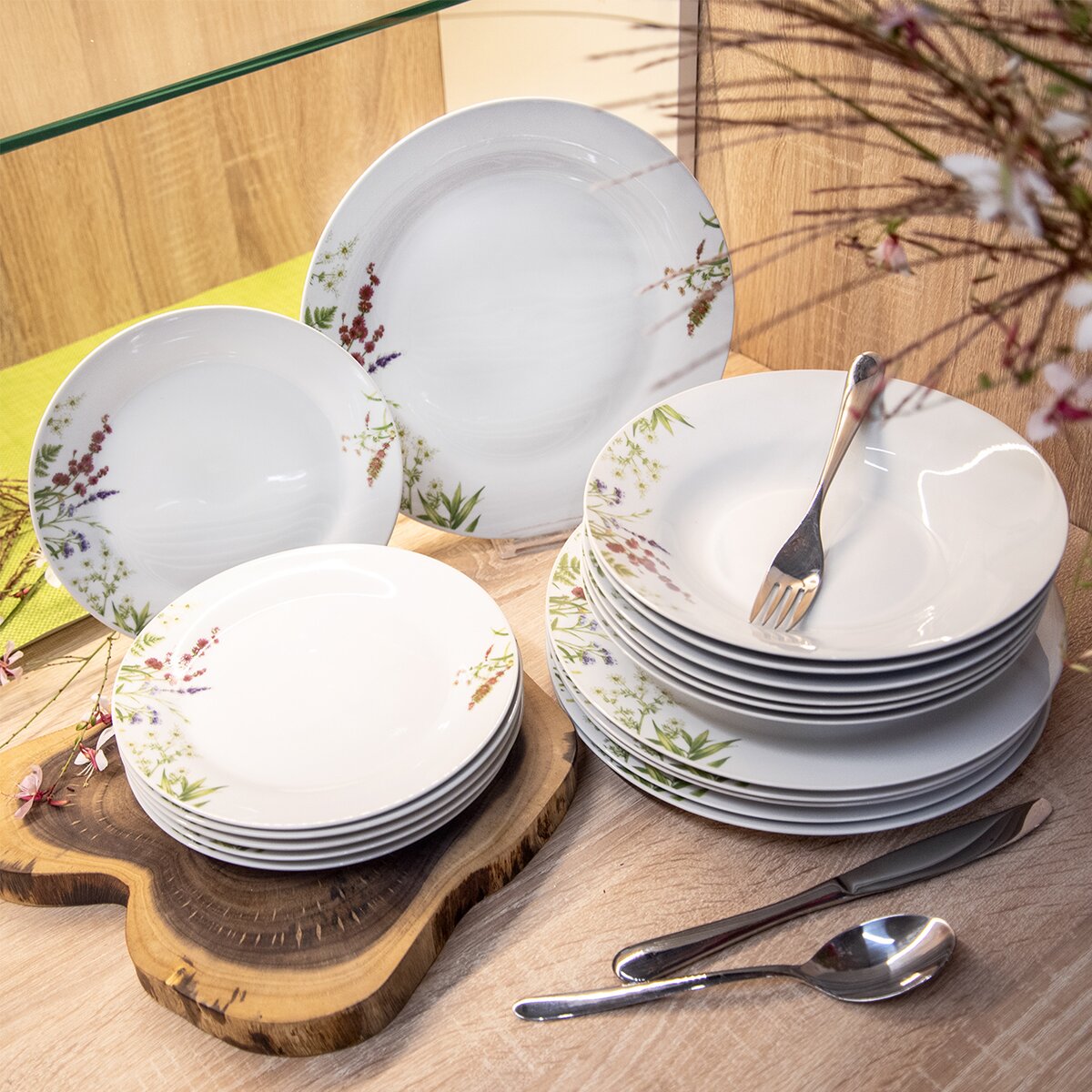 Kód produktu 112354Jídelní porcelánová sada se skládá z 6 kulatých dezertních, 6 mělkých a 6 hlubokých talířů s jemným květinovým dekorem, s motivy lučních květin.