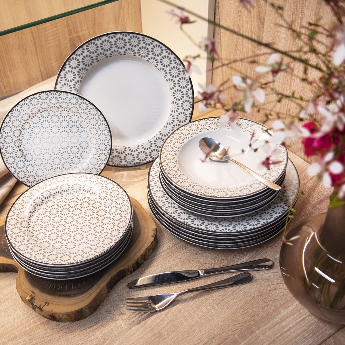 Kód produktu 112356Jídelní porcelánová sada se skládá z 6 kulatých dezertních, 6 mělkých a 6 hlubokých talířů s jemným dekorem, připomínajícím květy.