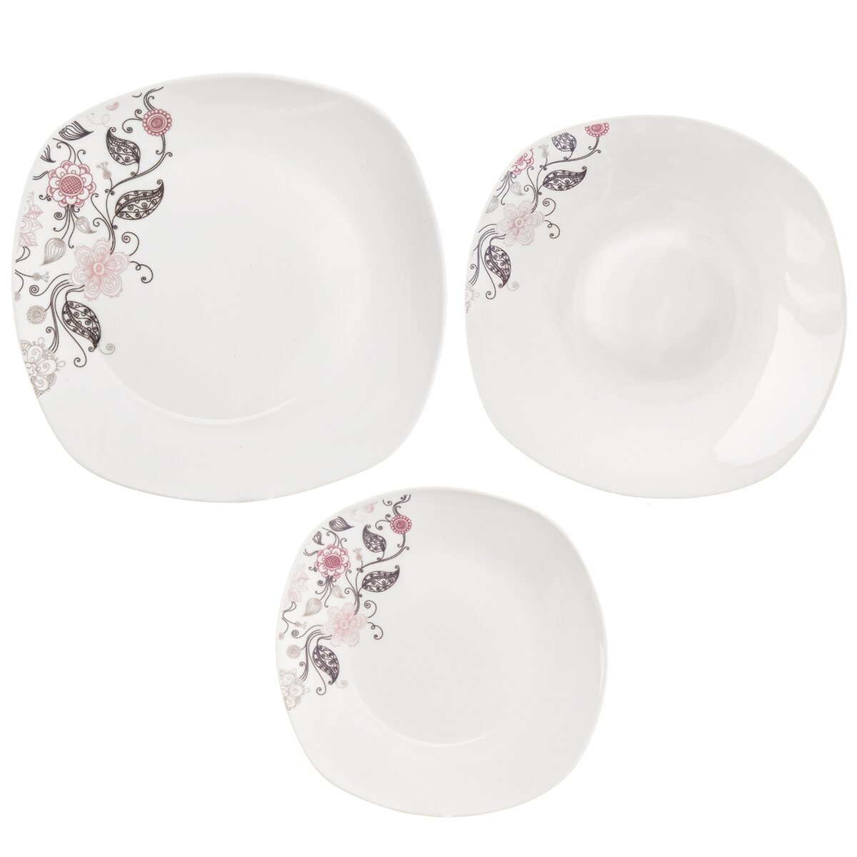 Kód produktu 112358Jídelní porcelánová sada se skládá z 6 hranatých dezertních, 6 mělkých a 6 hlubokých talířů s jemným květinovým dekorem.