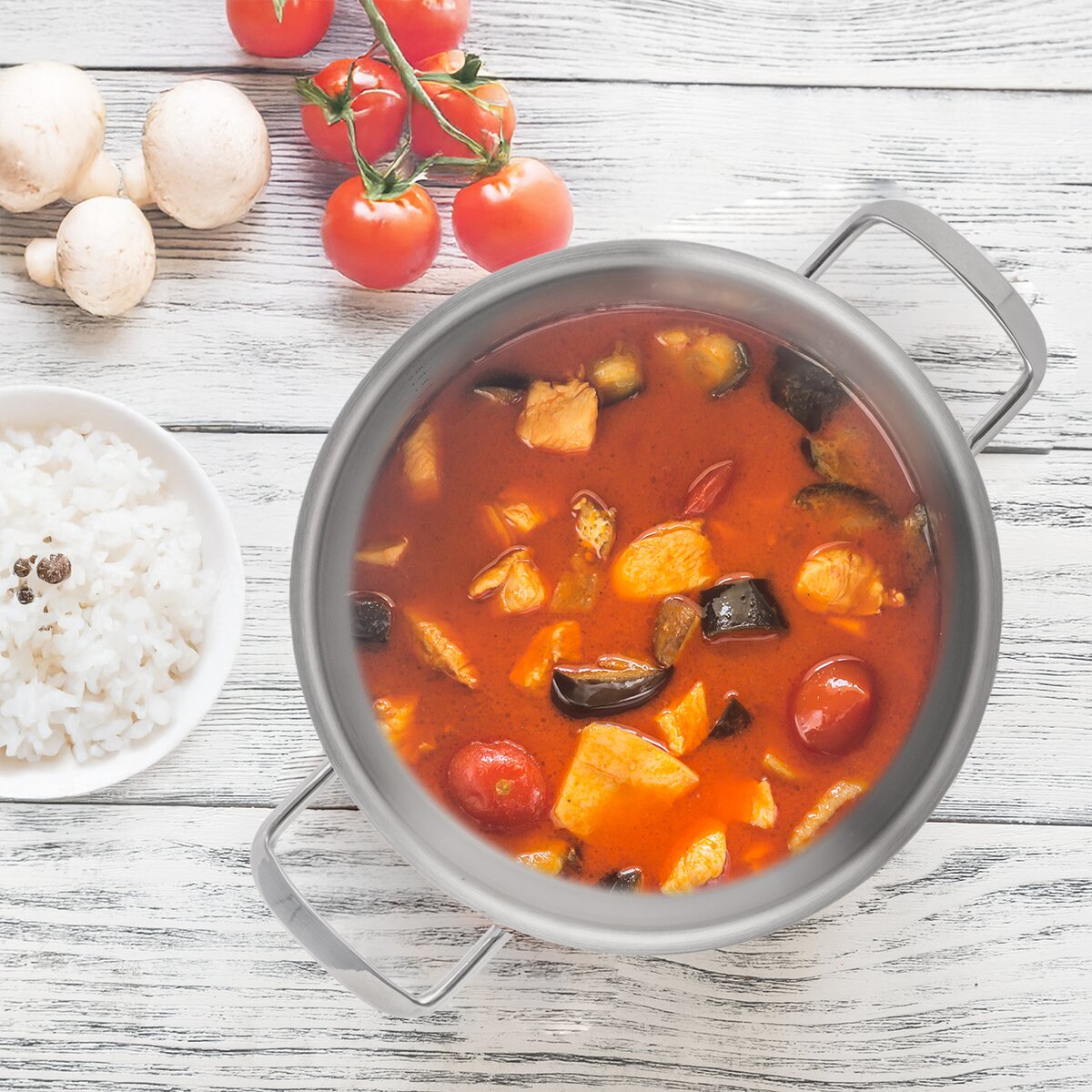 Materiál kastrolu tvoří nerezová ocel 304, sendvičové dno je z hliníku a nerezové oceli, poklice je skleněná s nerezovým okrajem a nerezovým úchytem upevněným šrouby se silikonovými podložkami.