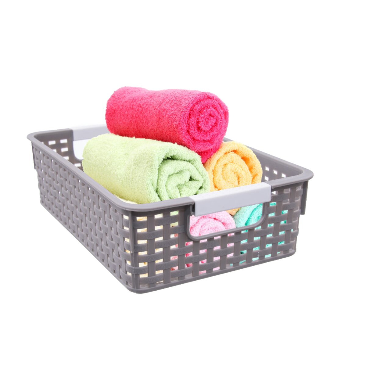 Košík s uchy na uložení různých drobností kdekoli v domácnosti. Materiál: plast. Barevný assort. Rozměry: 30,5x21x8 cm.