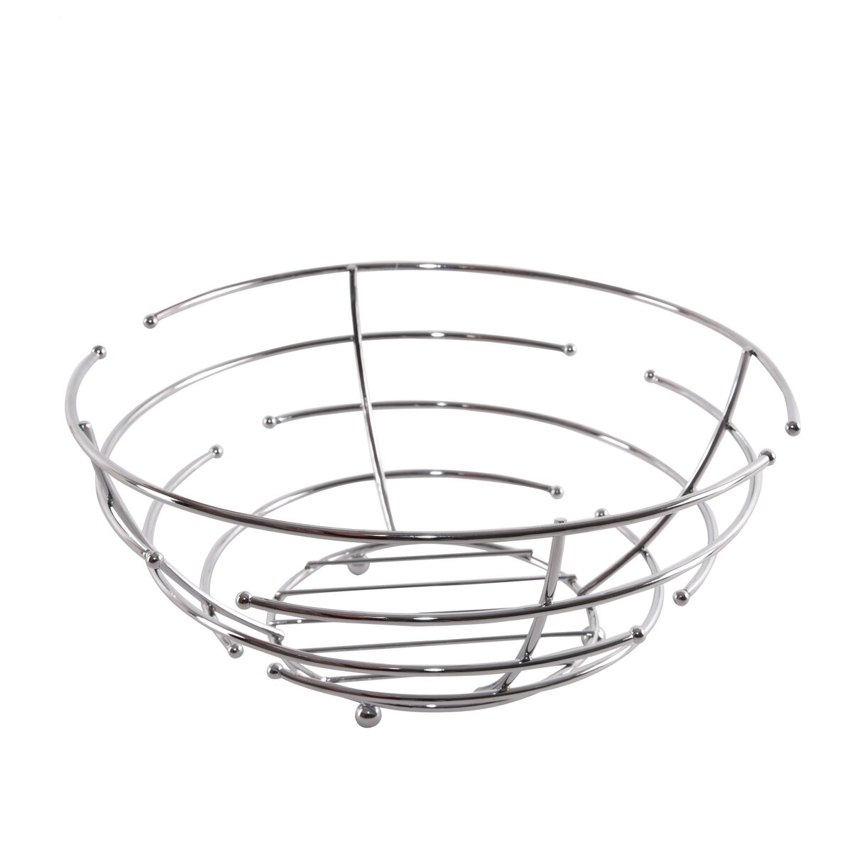 Košík na ovoce. Řada kvalitního drátěného programu – tl. drátu 4 mm. Materiál: kov – povrchová úprava chrom. Rozměry: pr. 25,5 cm, v. 11,5 cm.