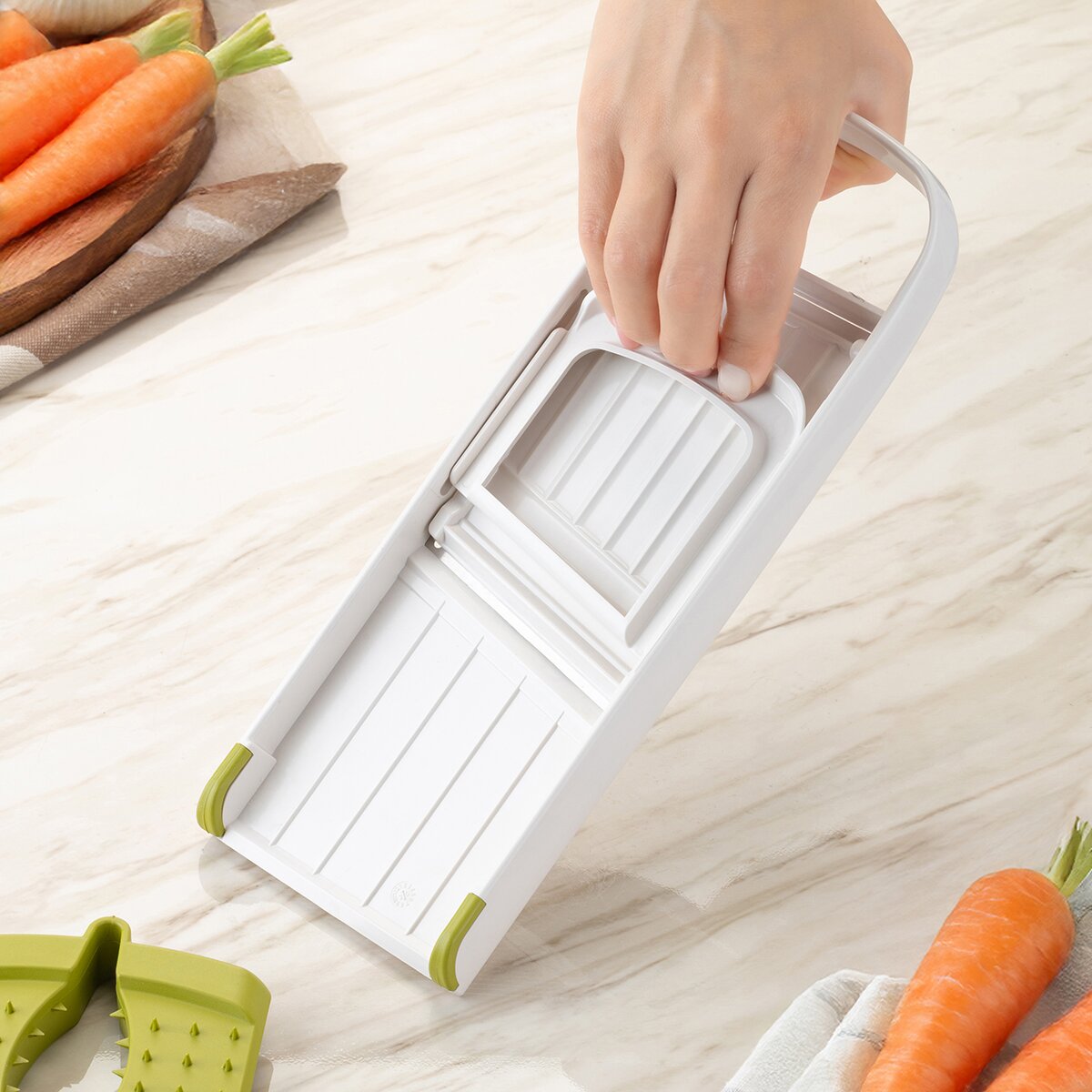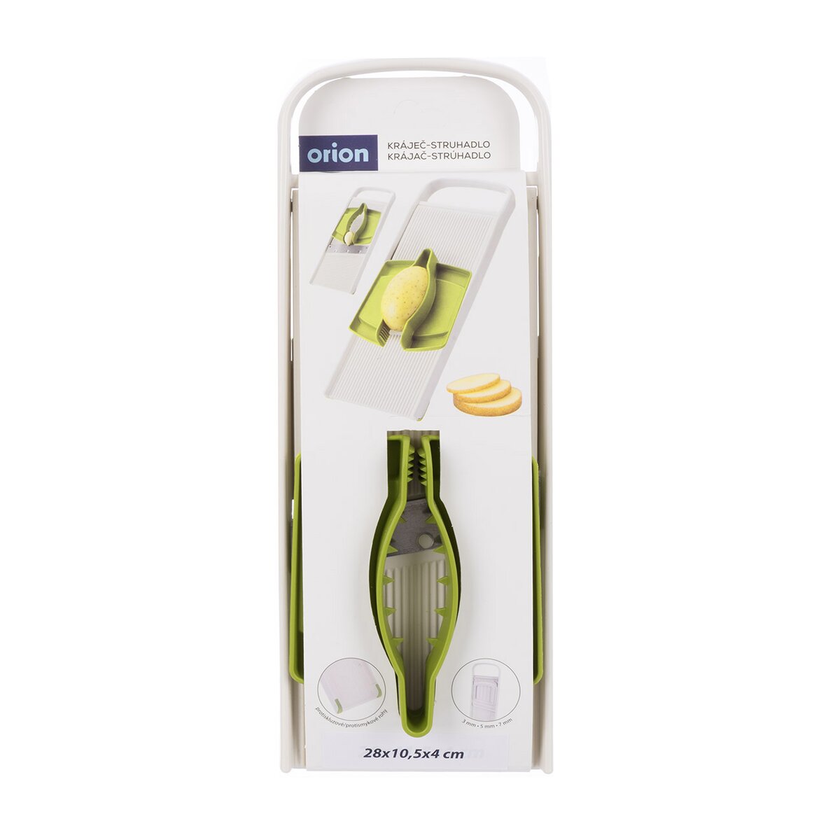 Kód produktu 144716Kráječ-struhadlo s vodicím držákem je praktickým pomocníkem pro rychlé a bezpečné krájení, plátkování potravin. Nastavitelná krájecí plocha se 3 stupni tloušťky řezu.