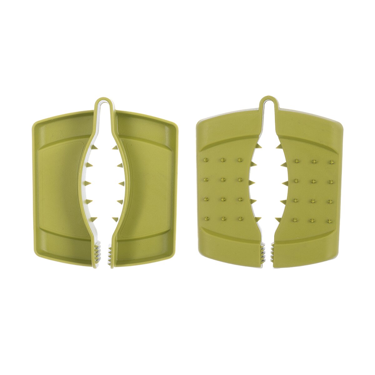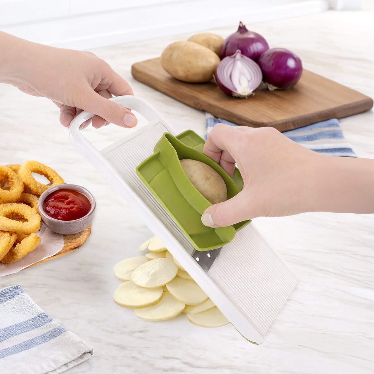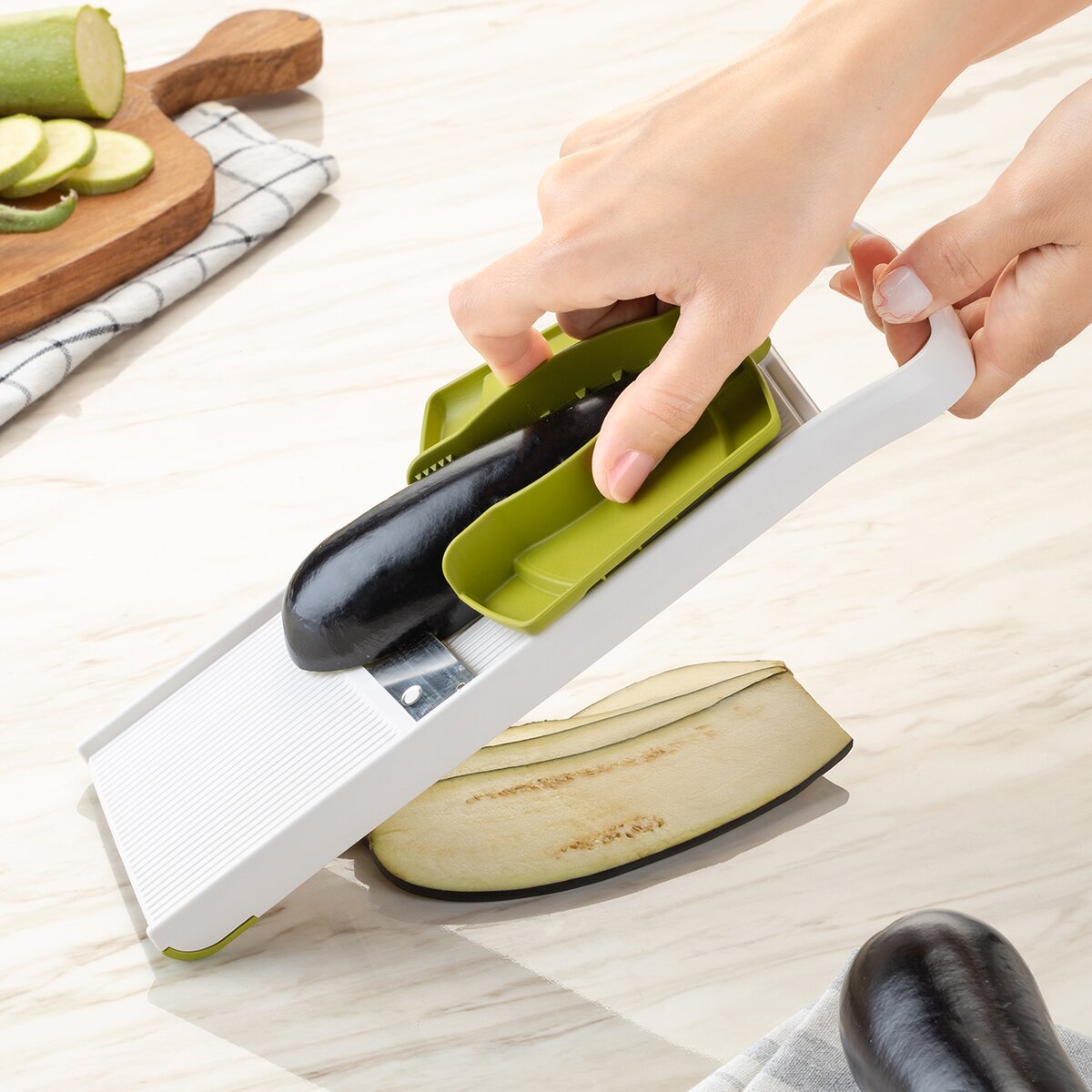 Kráječ je vybaven zeleným držákem proti poranění. Obsahuje speciální hroty, které zajišťují pevné uchycení potravin buď jejich nabodnutím nebo sevřením ve střední části. Umožňuje tudíž bezpečnou manipulaci při krájení brambor, kousku cukety, jablka, cibule, mrkve, okurků i malých surovin, například česneku. Pro větší stabilitu při použití obsahuje kráječ dva protiskluzové rohy z plastu EVA, které zabraňují nežádoucímu posunu kráječe. Kráječ je vyroben z plastu ABS a máostří z nerezové oceli 301, držák z plastu PP.