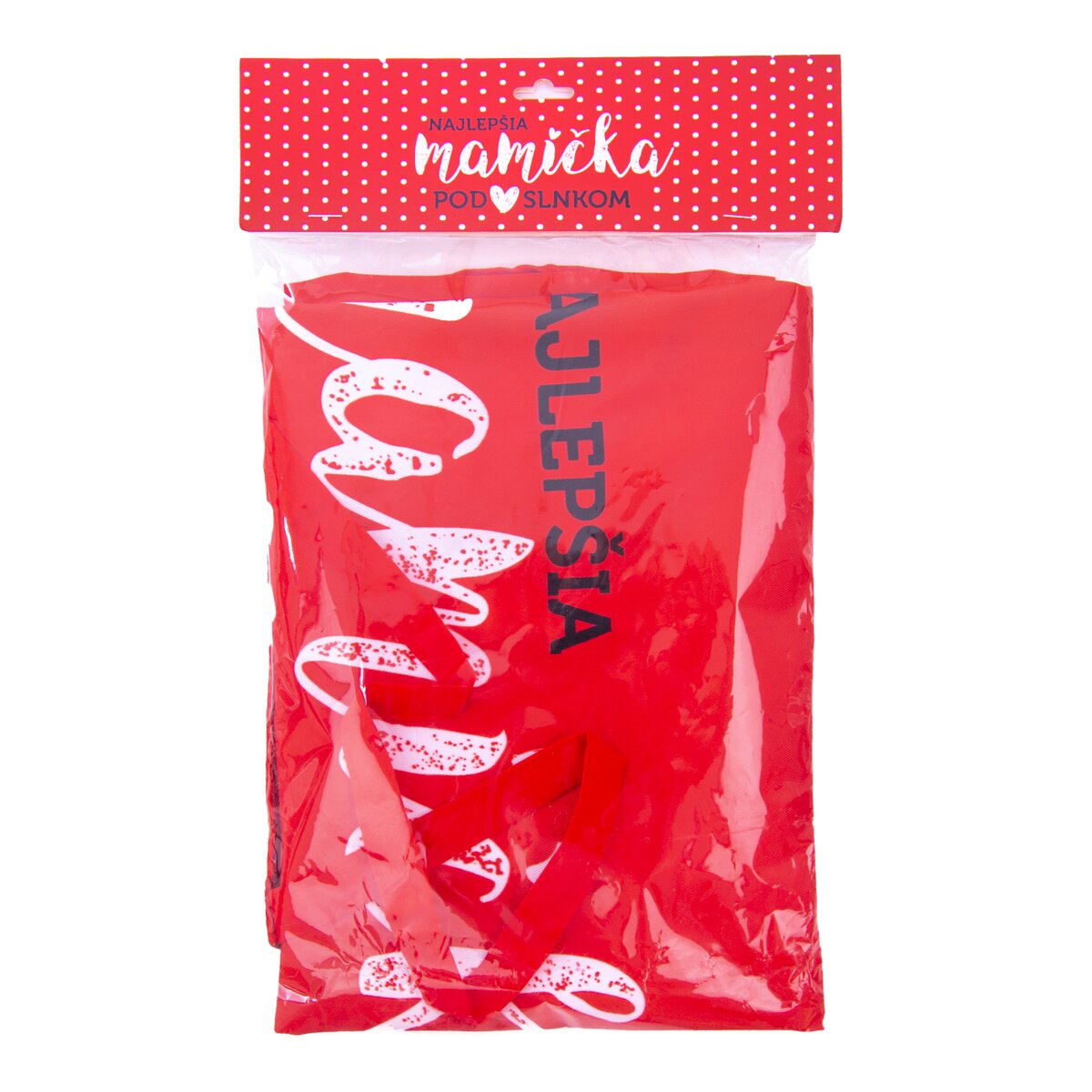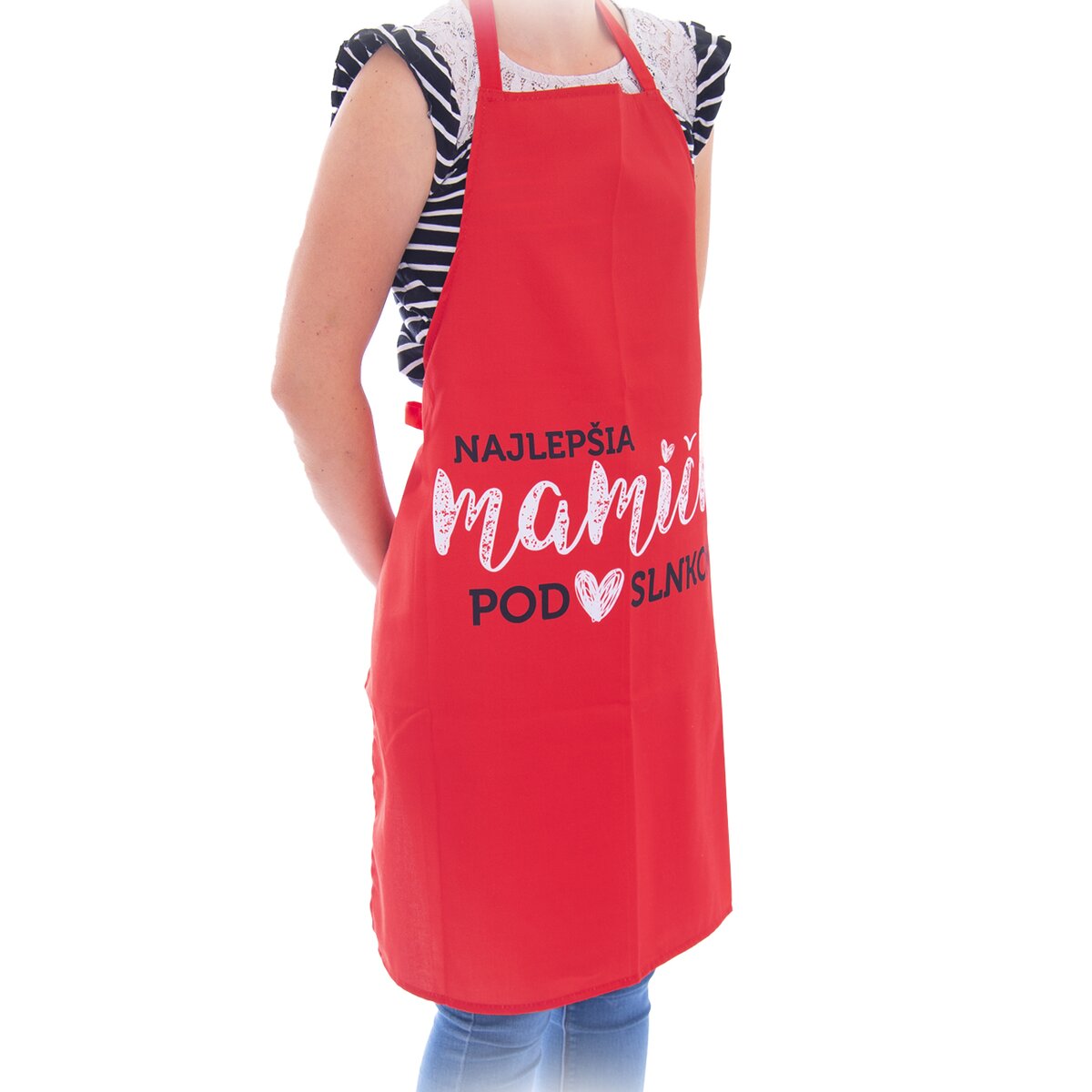 Kód produktu 960361Červená kuchyňská zástěra s nápisem Najlepšia mamička pod slnkom vyrobená ze 100% bavlny.