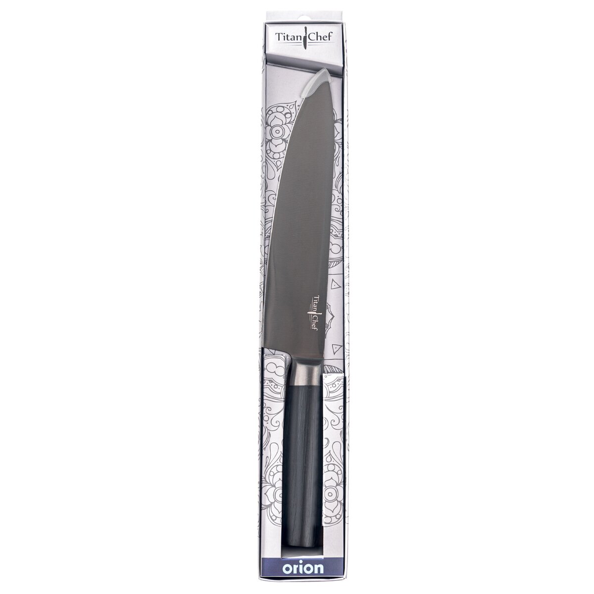 Kód produktu 831143Kvalitní nerezový kuchyňský nůž s tmavou titanovou vrstvou na 20,5 cm dlouhé čepeli a vyváženou plastovou rukojetí pro přesné krájení běžných surovin v kuchyni.