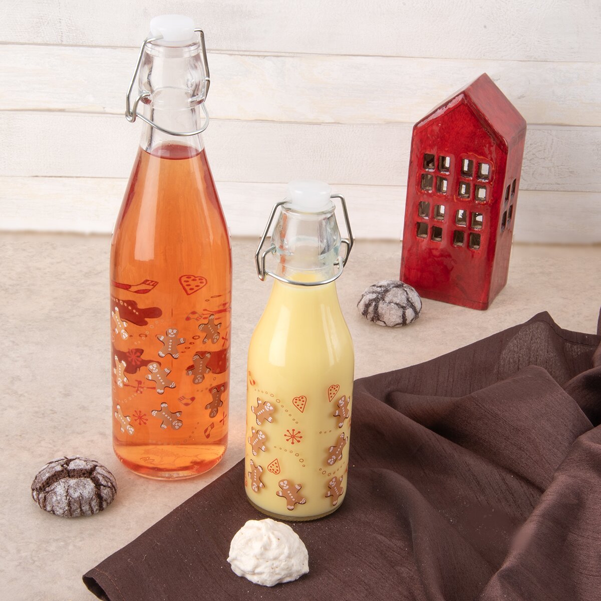 Menší láhev s dekorem roztomilých perníčků je ideální na slivovičku, vaječný likér, sirup, šťávu a jiné nápoje. Je opatřena kovovou přezkou s klipovým uzavíráním.