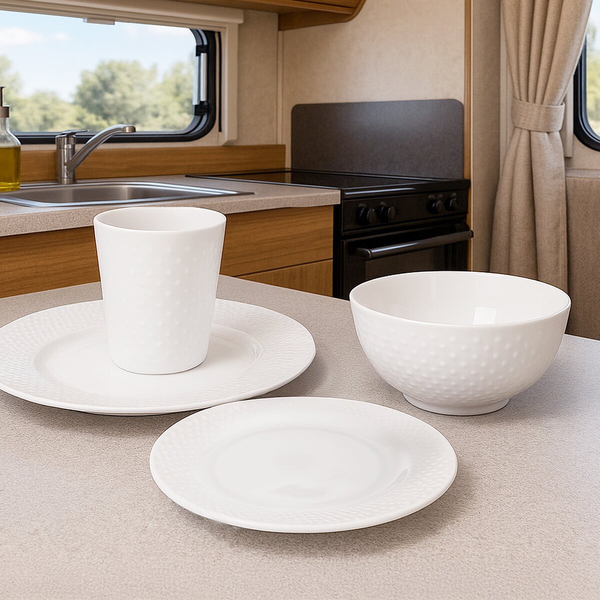Více informacíAčkoliv vypadá jako porcelán, jde o plast. Toto nadčasové, elegantní nádobí v bílém provedení s drobnými kulatými výstupky po obvodu okouzlí každého.