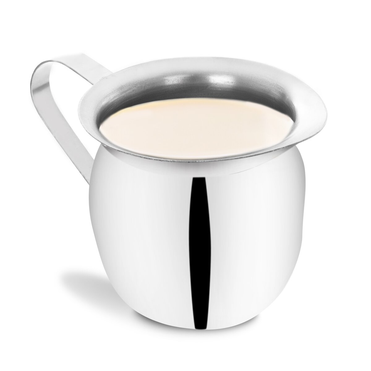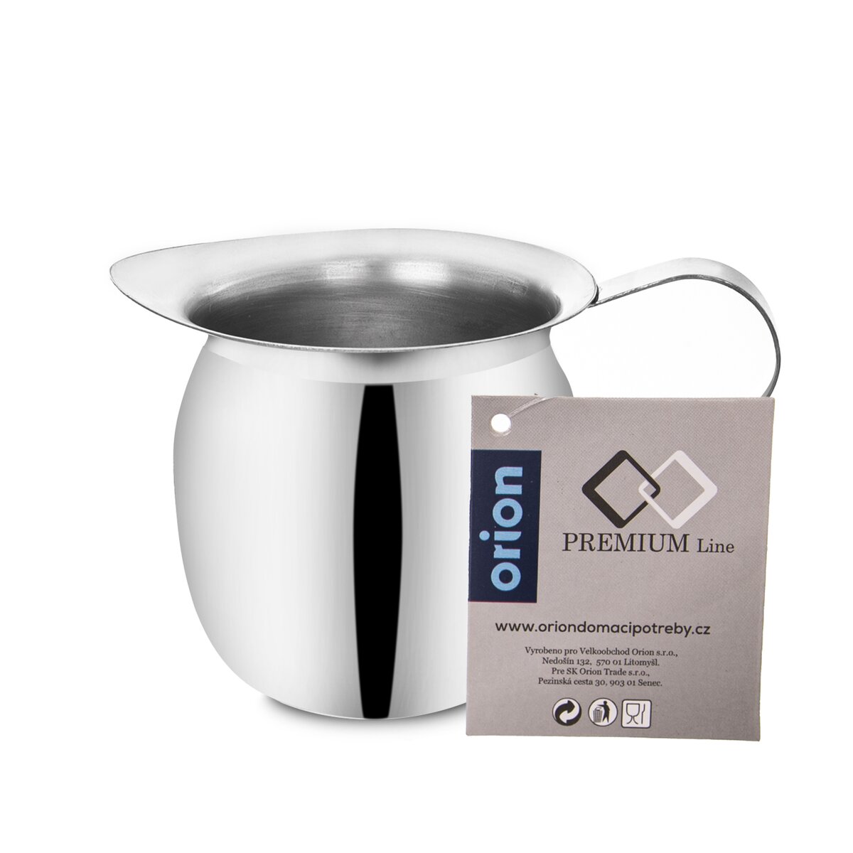 Mlékovka s uchem. Materiál: nerez. Rozměry: v. 8 cm, objem 0,25 l.