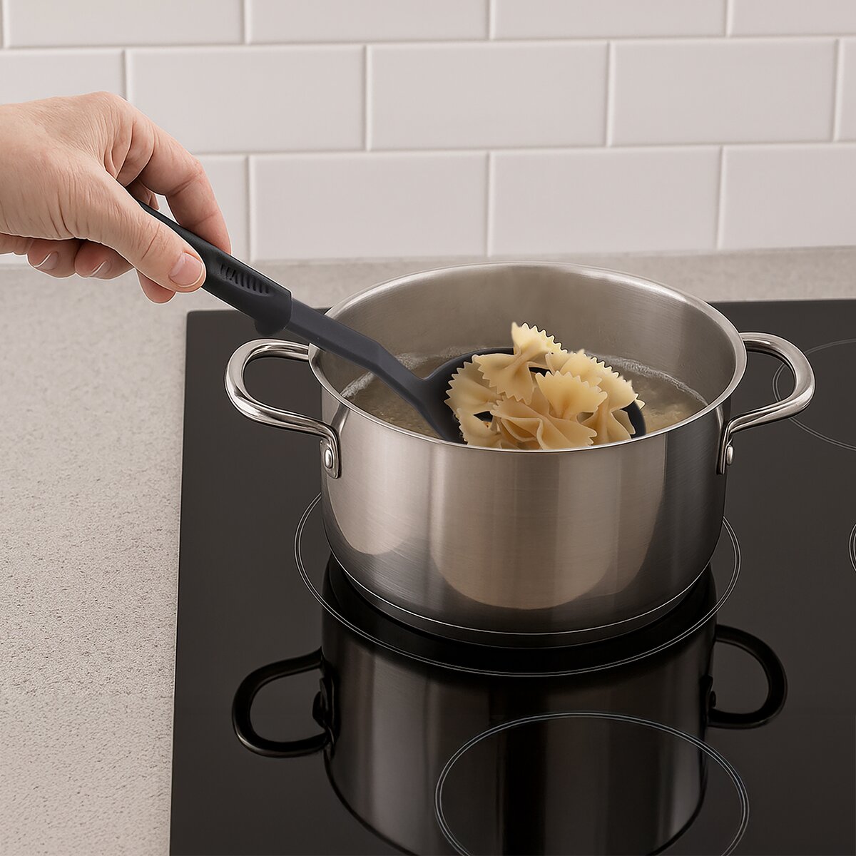 Naběračka je vyrobena z odolného termoplastu PBT, který odolává teplotám až do +200 °C. Materiál je trvanlivý, vhodný pro mytí v myčce a bezpečný pro použití s nepřilnavým nádobím.