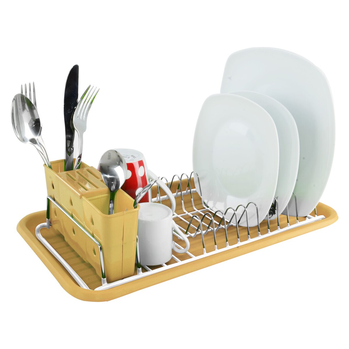 Usnadněte si mytí nádobí. Tento odkapávač je rozdělený do tří sekcí. Jeho součástí je konstrukce na talíře, odkládací plocha na hrnečky i stojan na příbory.