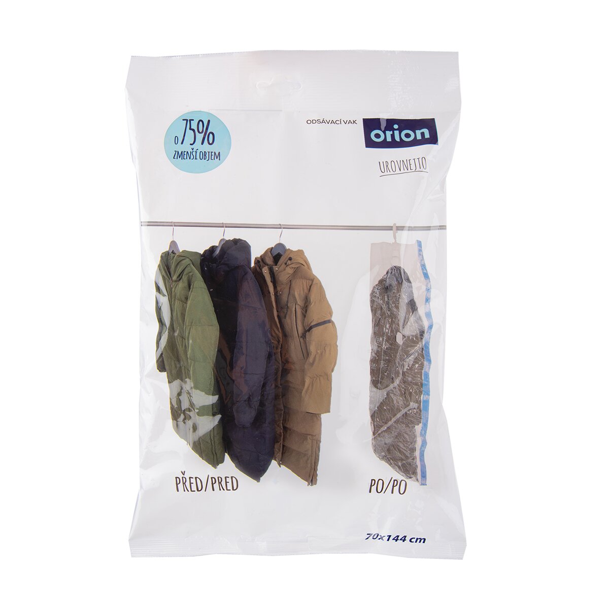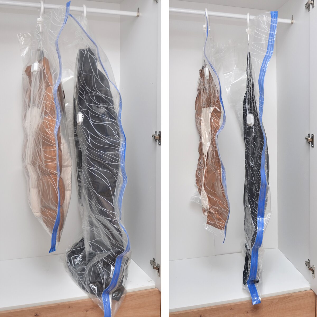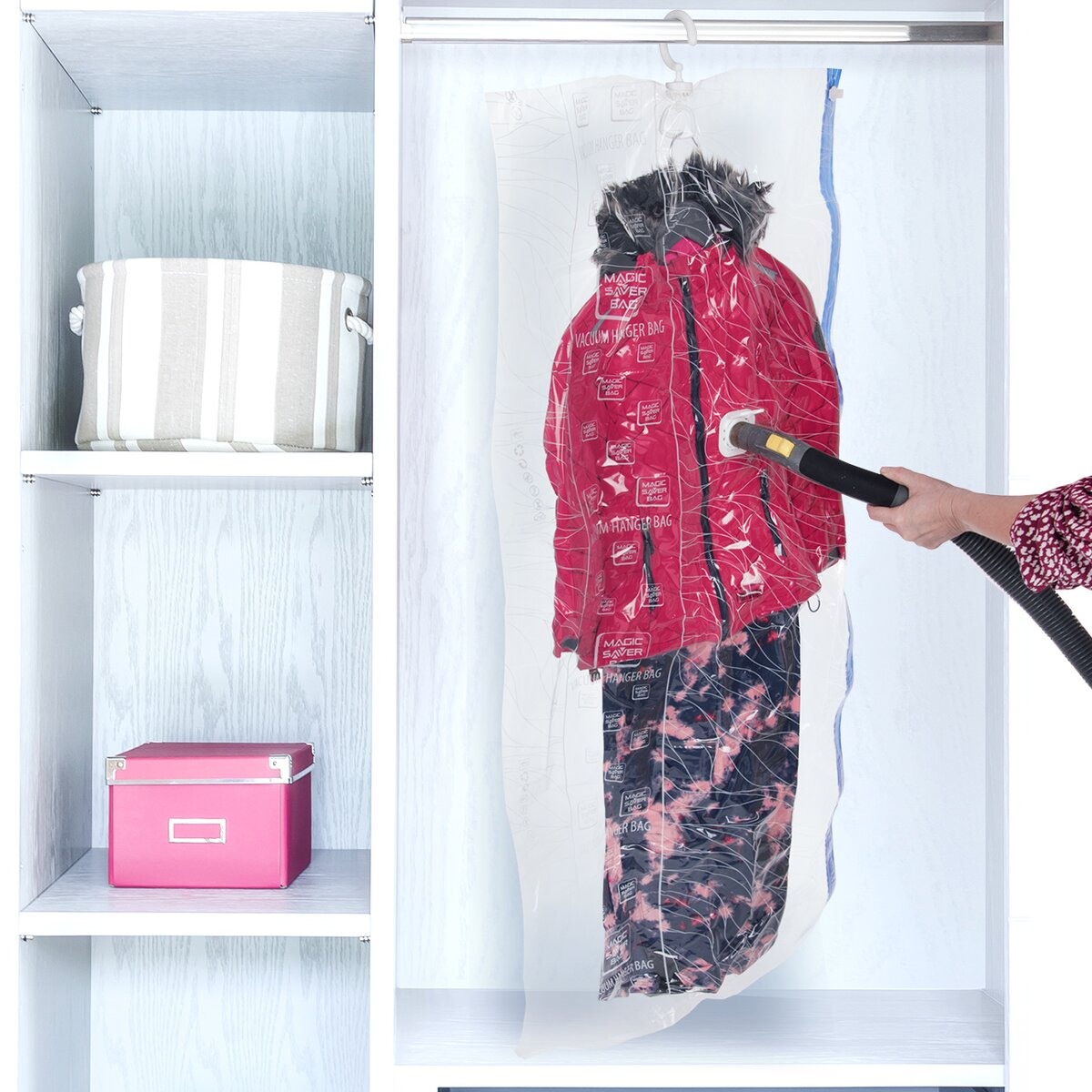 A jak na to? Oblečení vložíte na ramínku do vaku (buď položeného na zemi nebo rovnou zavěšeného na šatní tyči), uzavřete modrý lem, otevřete kryt ventilu, vysavačem odsajete vzduch, zacvaknete ventil a je hotovo. Po odsátí vzduchu z vaku se objem vaku výrazně zmenší (až o 75 %) a Vy ušetříte místo na ukládání. Oděvy zároveň chráníte před vlhkem, roztoči, moly i prachem.