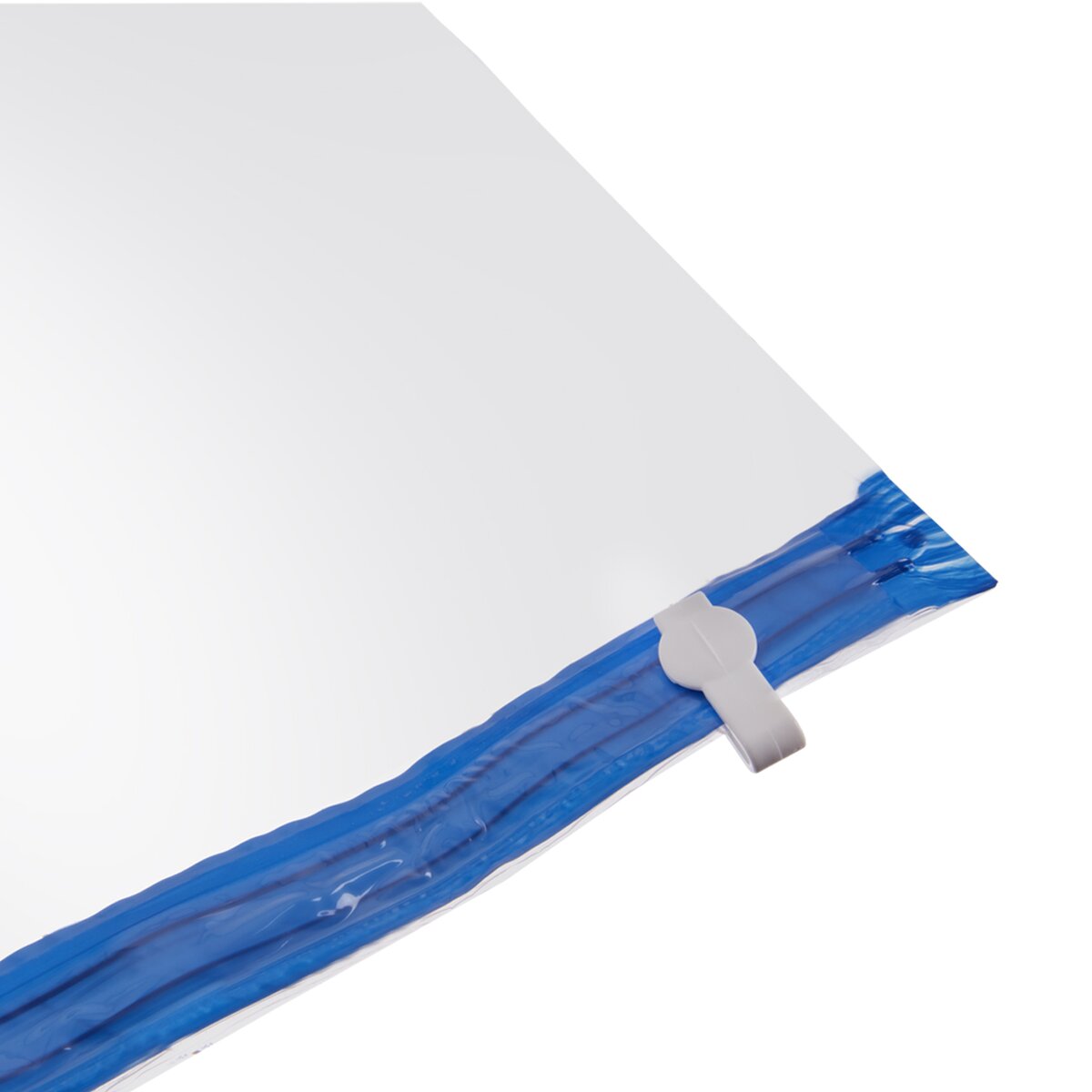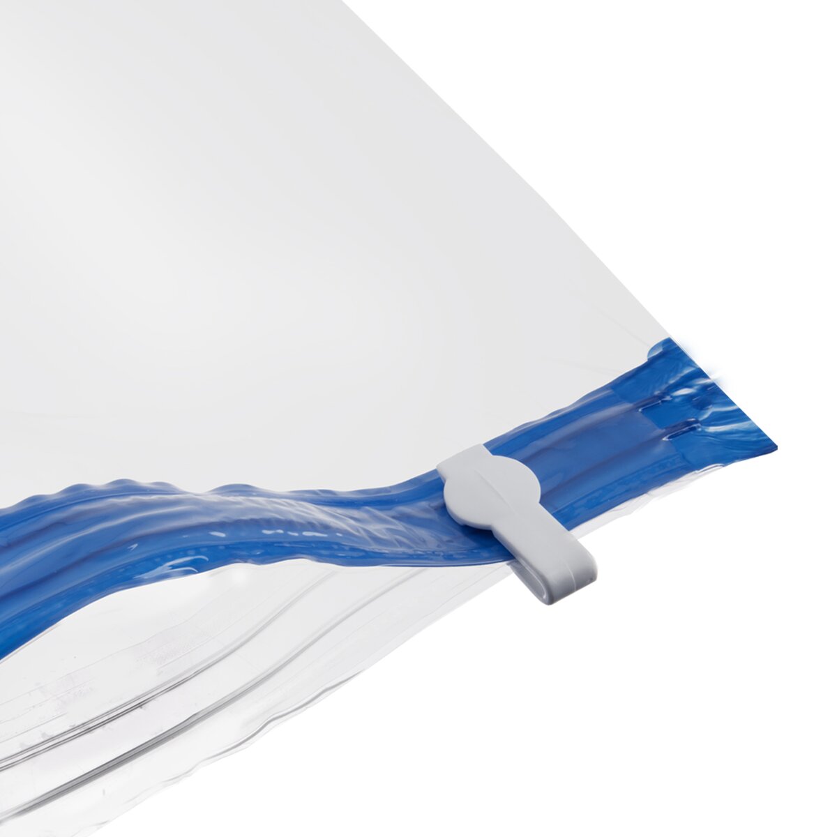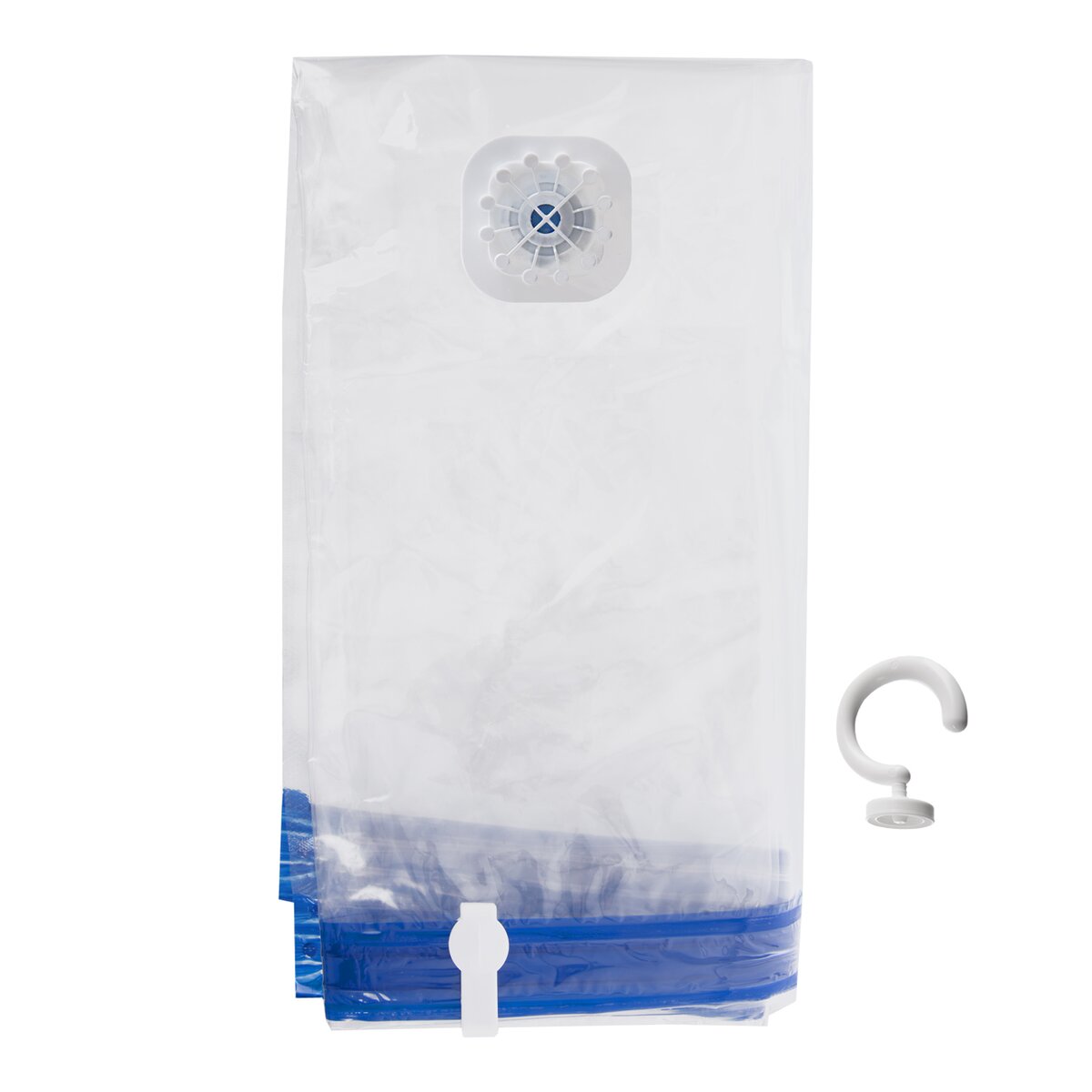 A jak na to? Oblečení vložíte na ramínku do vaku (buď položeného na zemi nebo rovnou zavěšeného na šatní tyči), uzavřete modrý lem, otevřete kryt ventilu, vysavačem odsajete vzduch, zacvaknete ventil a je hotovo. Po odsátí vzduchu z vaku se objem vaku výrazně zmenší (až o 75 %) a Vy ušetříte místo na ukládání. Oděvy zároveň chráníte před vlhkem, roztoči, moly i prachem.