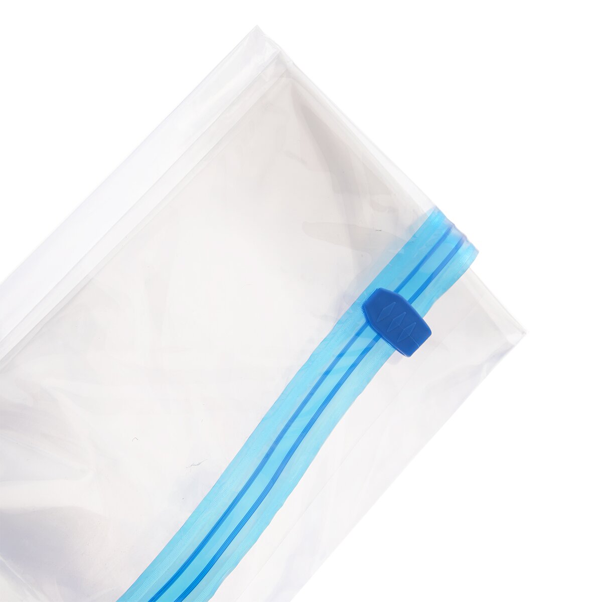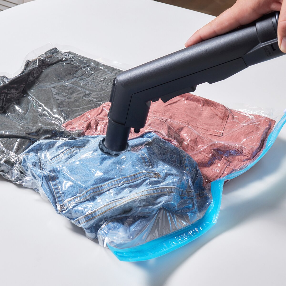 Vybrané textilie jednoduše vložíte do vaku a jezdcem uzavřete modrý pás, jako by to byl zip. Pak stačí otevřít ventil bez krytky do polohy ON, přiložit vysavač nebo pumpičku na odsávání vaků a vysát vzduch. Ventil poté utáhněte do polohy OFF, vysavač odejměte a uzavřete krytkou. Objem pytle se výrazně zmenší a vy tak ušetříte místo ve skříni, šatně nebo v zásuvce pod postelí. Díky tomu, že je vak průhledný, budete mít lepší přehled o jeho obsahu.