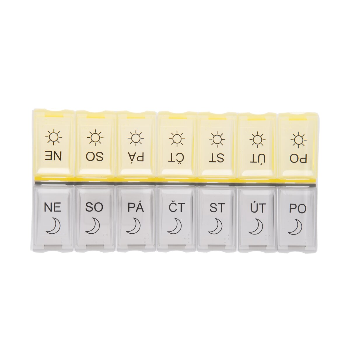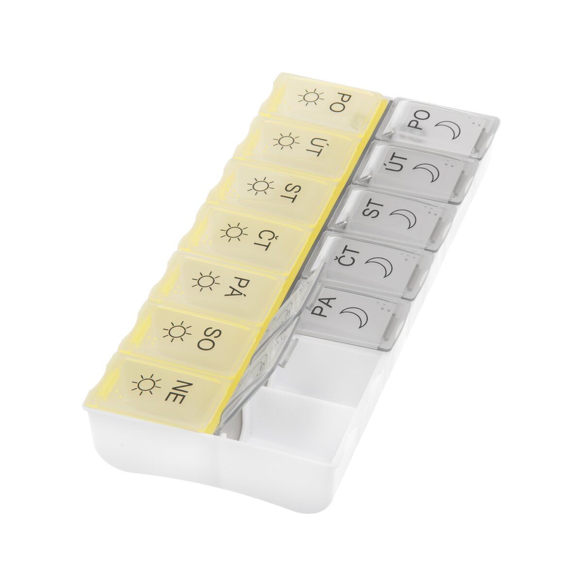 Kód produktu 811260Plastový organizér k uložení léků na celý týden má zavírací transparentní víčka a přehledný popis dnů. Je rozdělen na přihrádky pro léky, které je třeba brát ráno a večer.