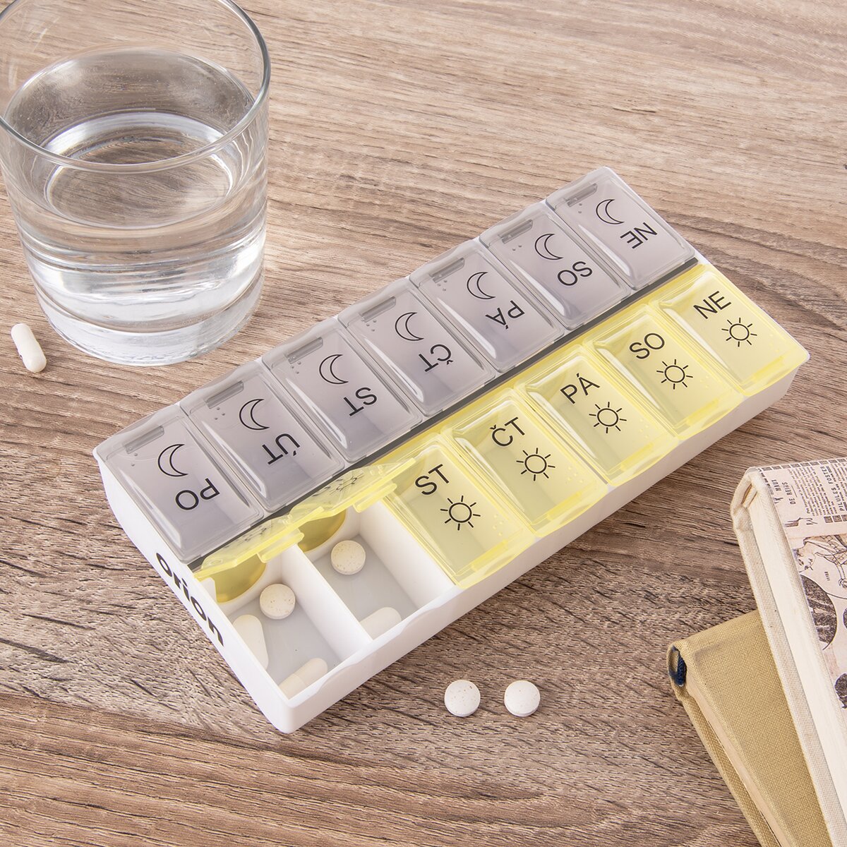 Jedna část má rozměr 3,7x2,5x3 cm, tudíž se do ní vejde více tablet. Organizér je vyroben z plastu PP.