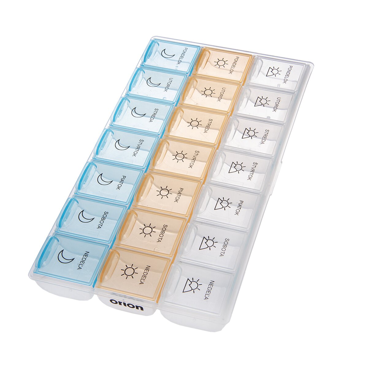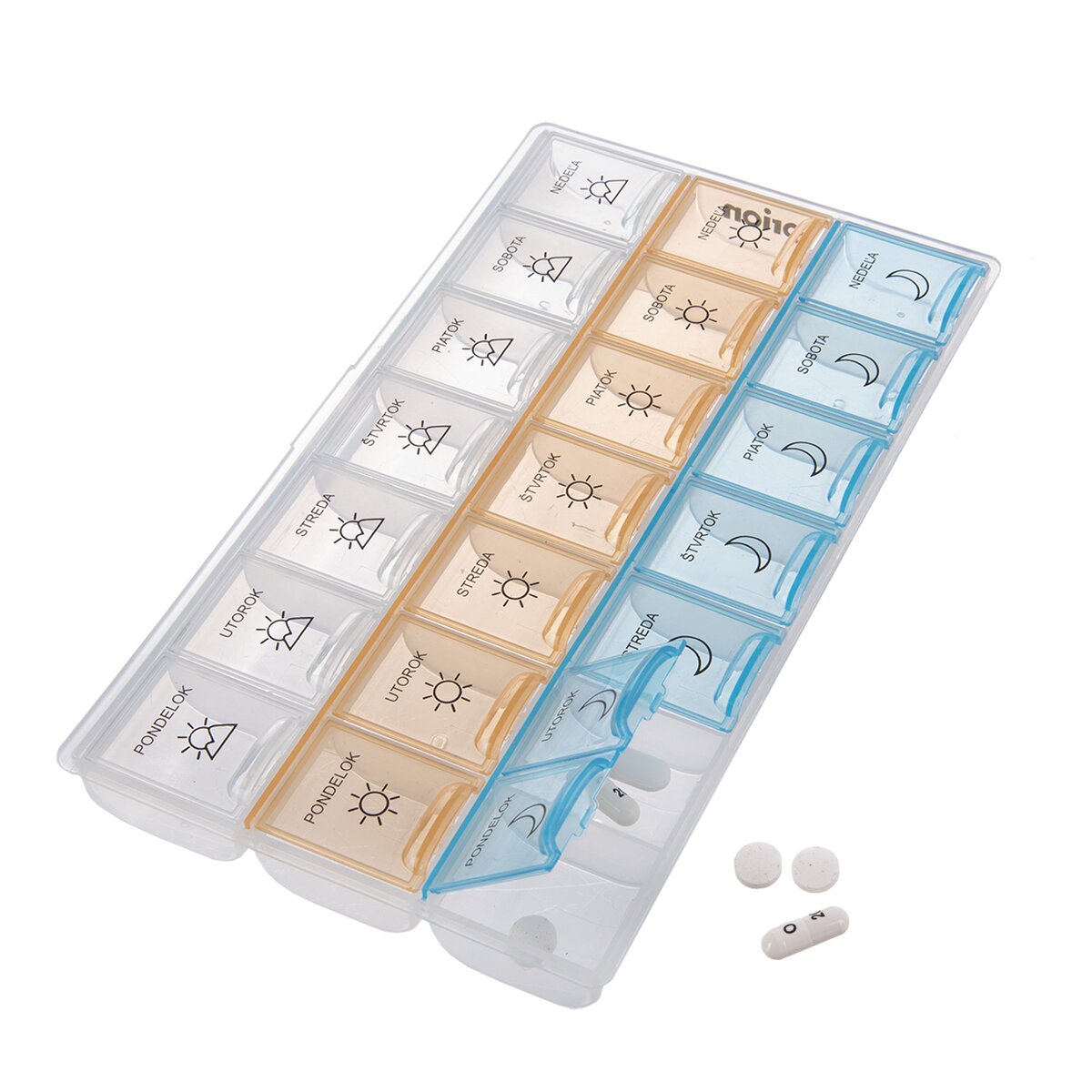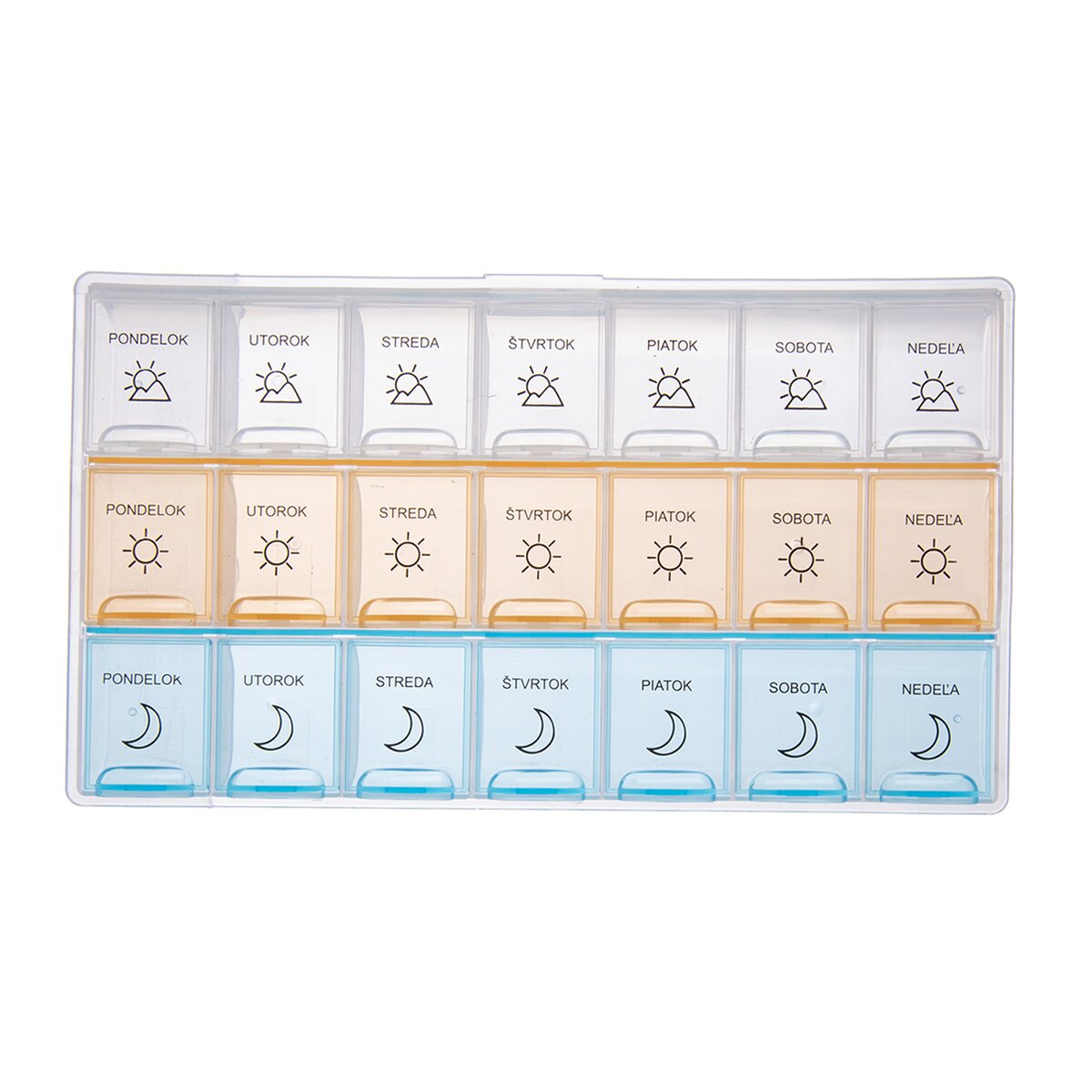 Kód produktu 811263Plastový organizér k uložení léků na celý týden má zavírací transparentní víčka a přehledný popis dnů. Je rozdělen na přihrádky pro léky, které je třeba brát ráno, v poledne a večer.