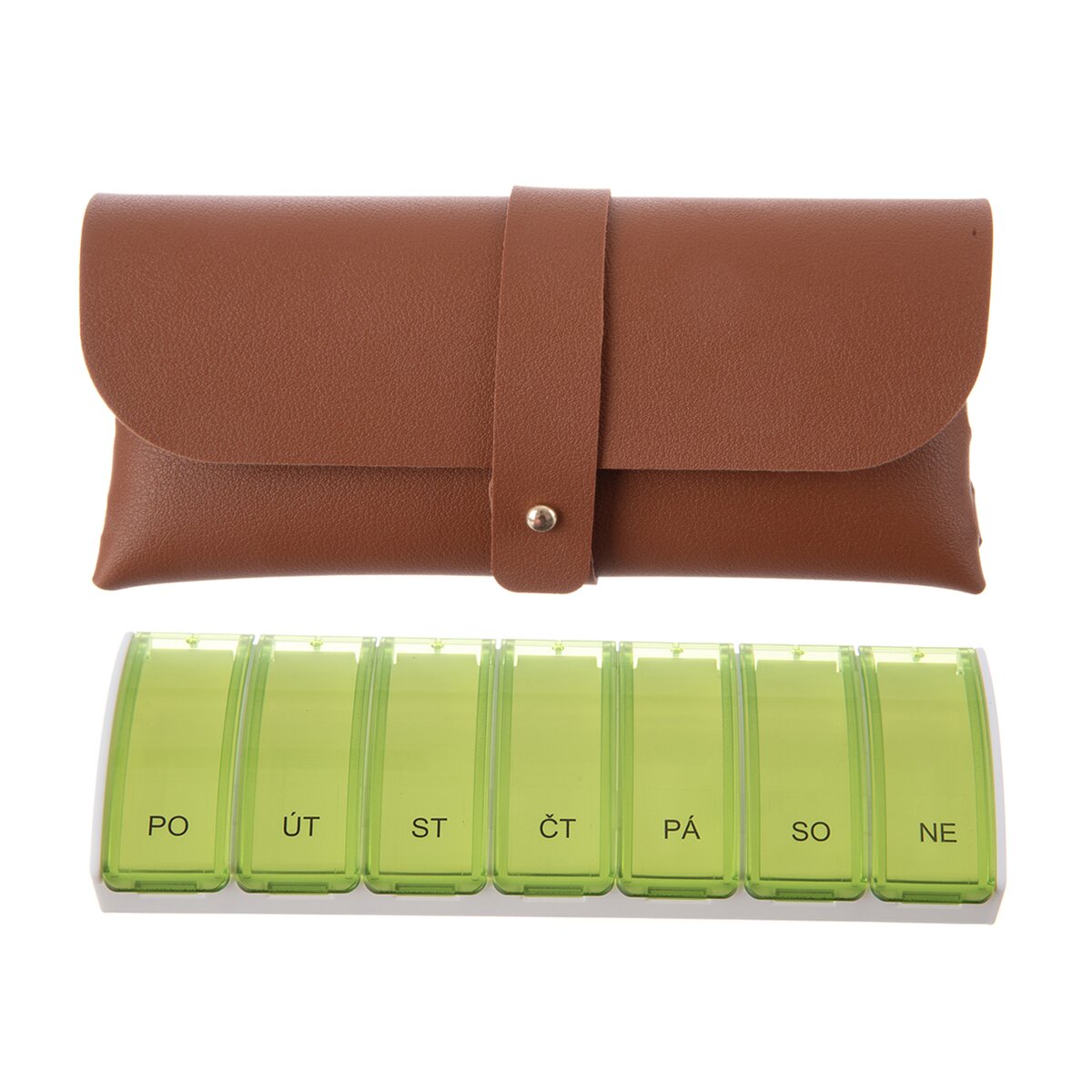 Organizér je vyroben z plastu PP a uložen v elegantním pouzdře (PU a kov), takže i na služební cestě, na dovolené nebo při pobytu u přátel a známých budou léky nenápadně uložené.